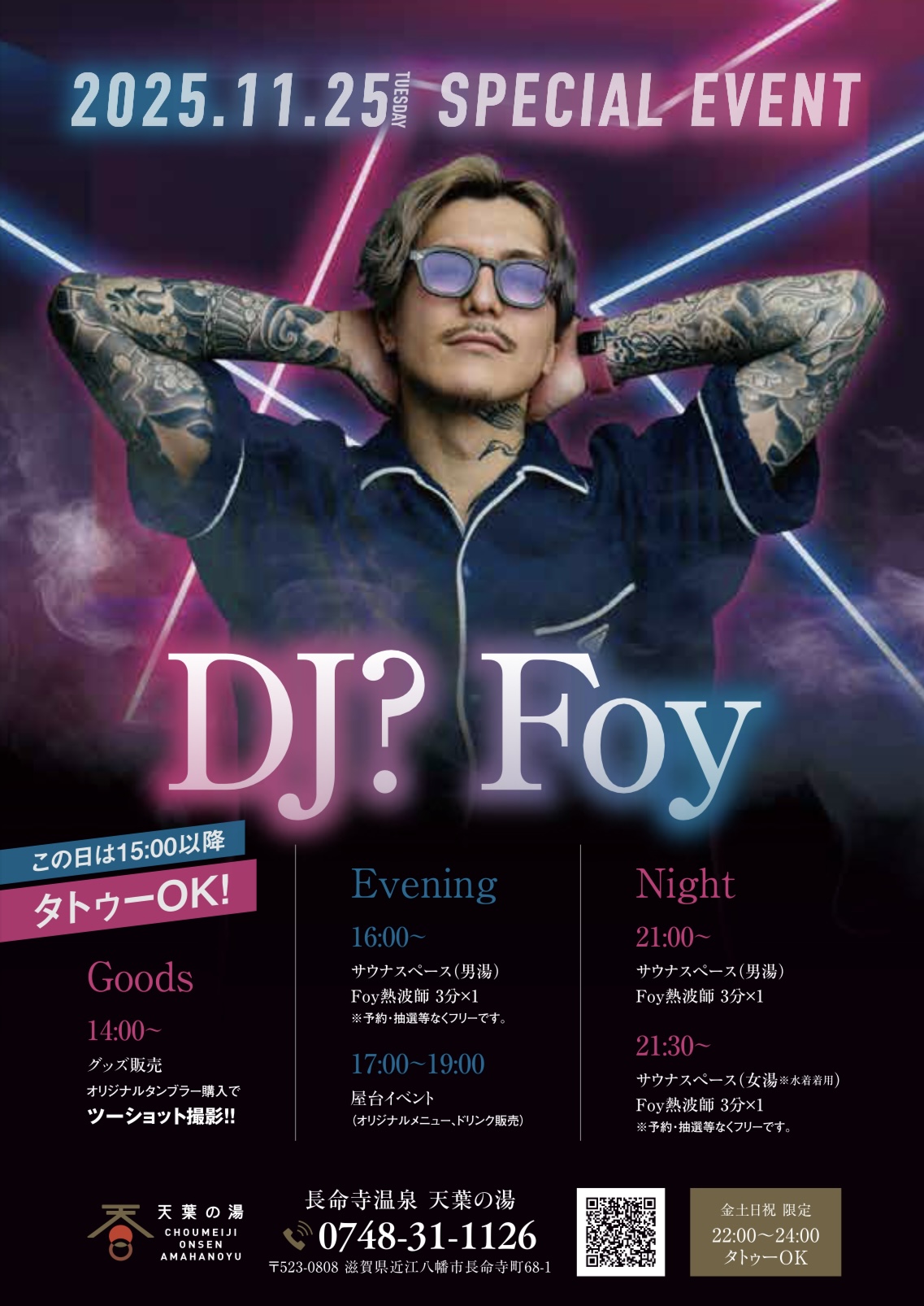 今回登場するのは、SNSでも話題沸騰中のDJFoyさん!!サウナ好きなら見逃せない、特別な1日になりそうです✨