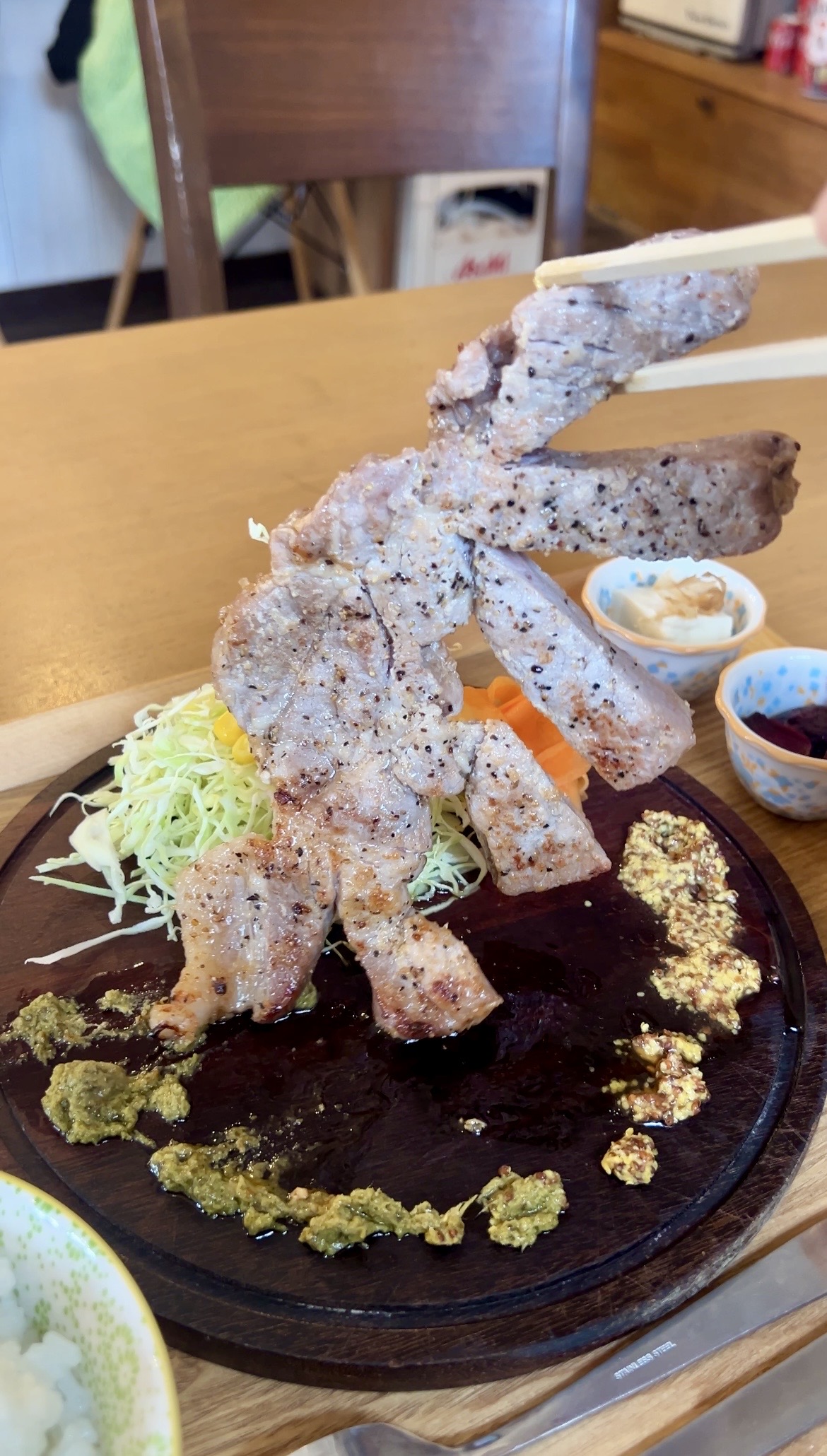 まずは見た目のインパクトにびっくり。約200gの豚肉がドンっと乗っていて、これはテンション上がります。