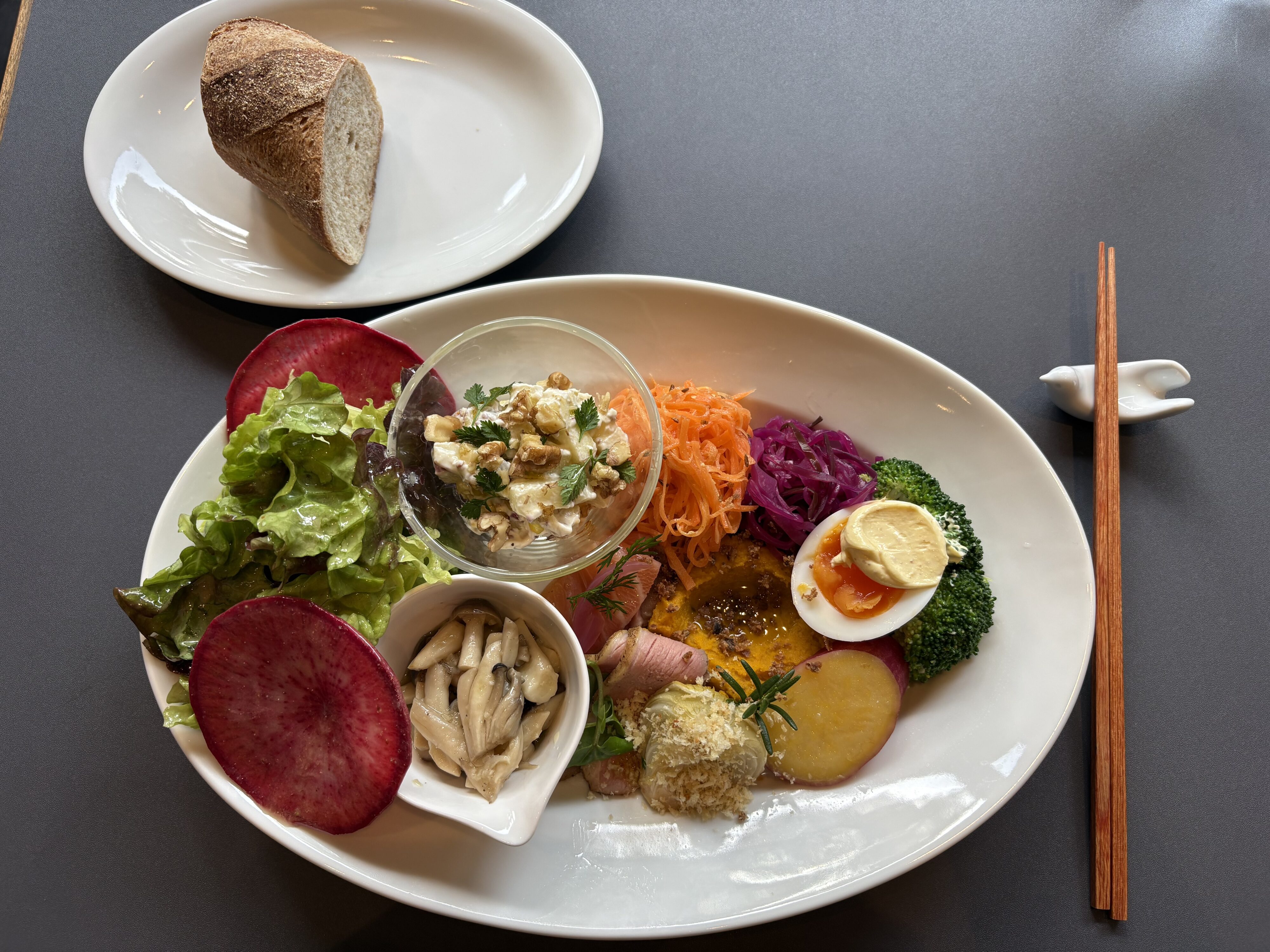 12種の冷製デリと温かいデリ3種が並ぶプレートは彩り豊かで、野菜のボリュームもたっぷり。