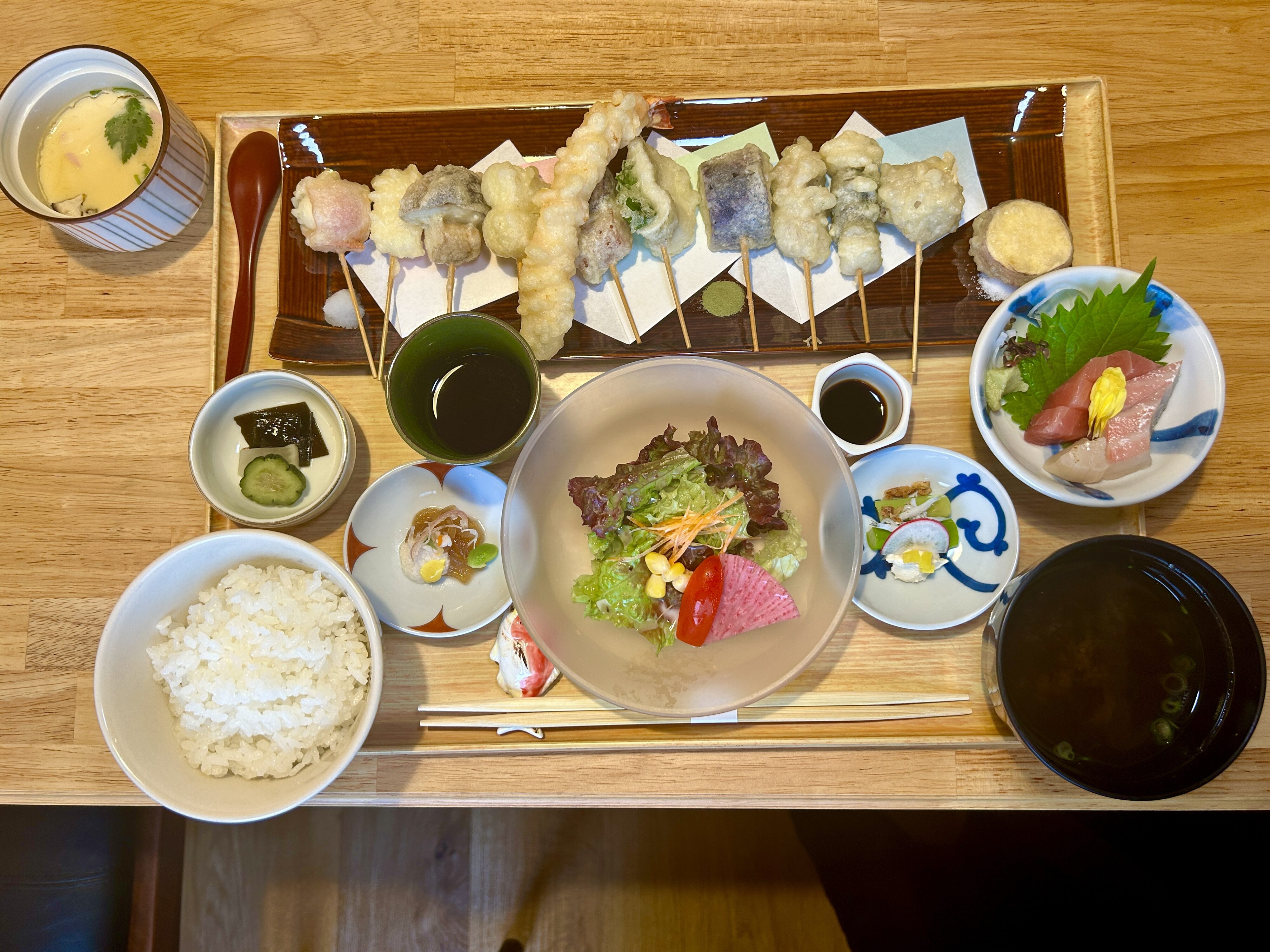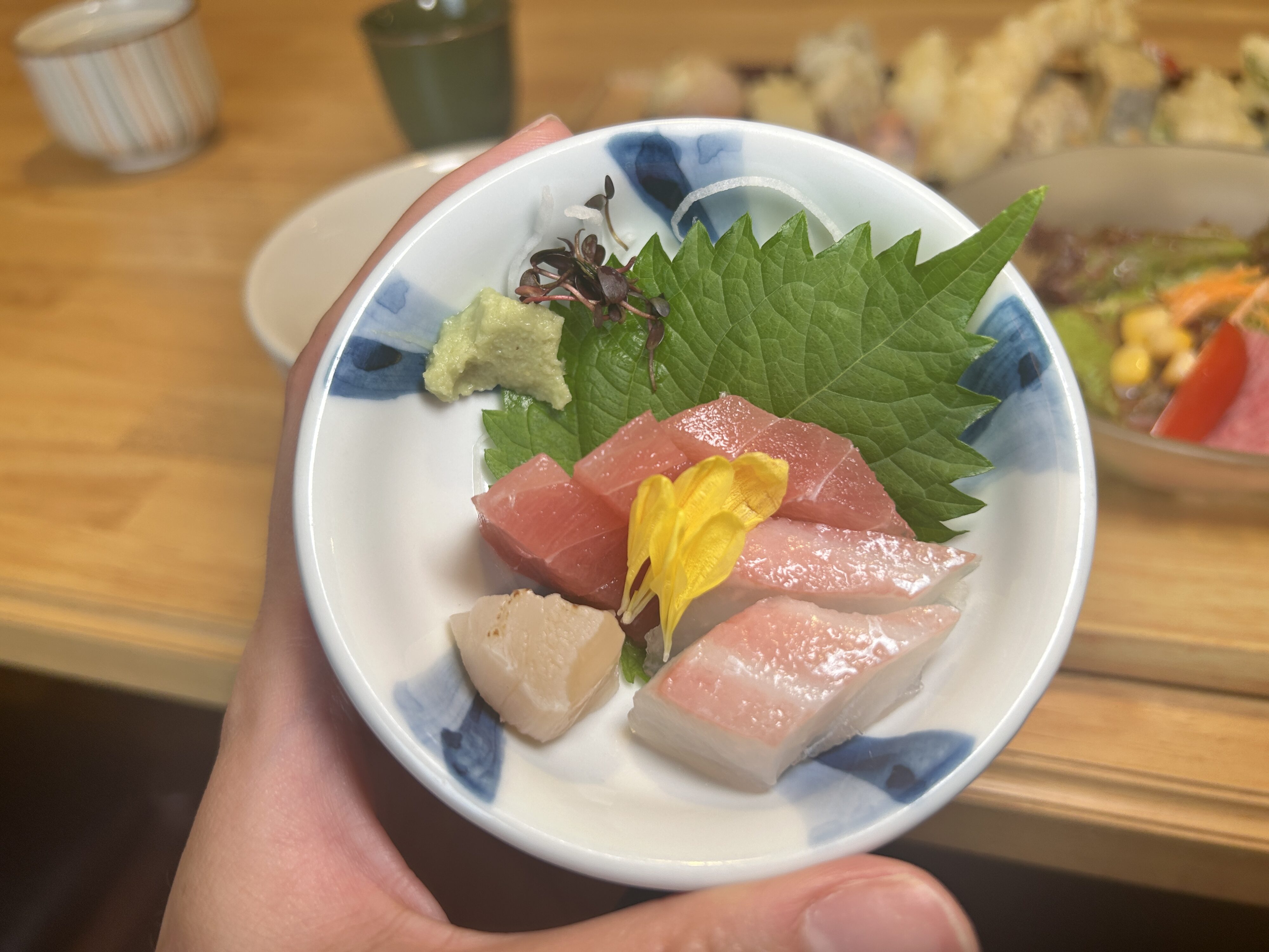 さらに色鮮やかなお刺身や、小鉢、サラダ、茶碗蒸しもセットになっており、バランスも満点!お刺身は新鮮で脂がのっていて、天ぷらとの相性も抜群。品数が多いのにひとつひとつ丁寧に作られていて「ちょっと贅沢なランチを楽しみたい日」にぴったりの内容です☺️