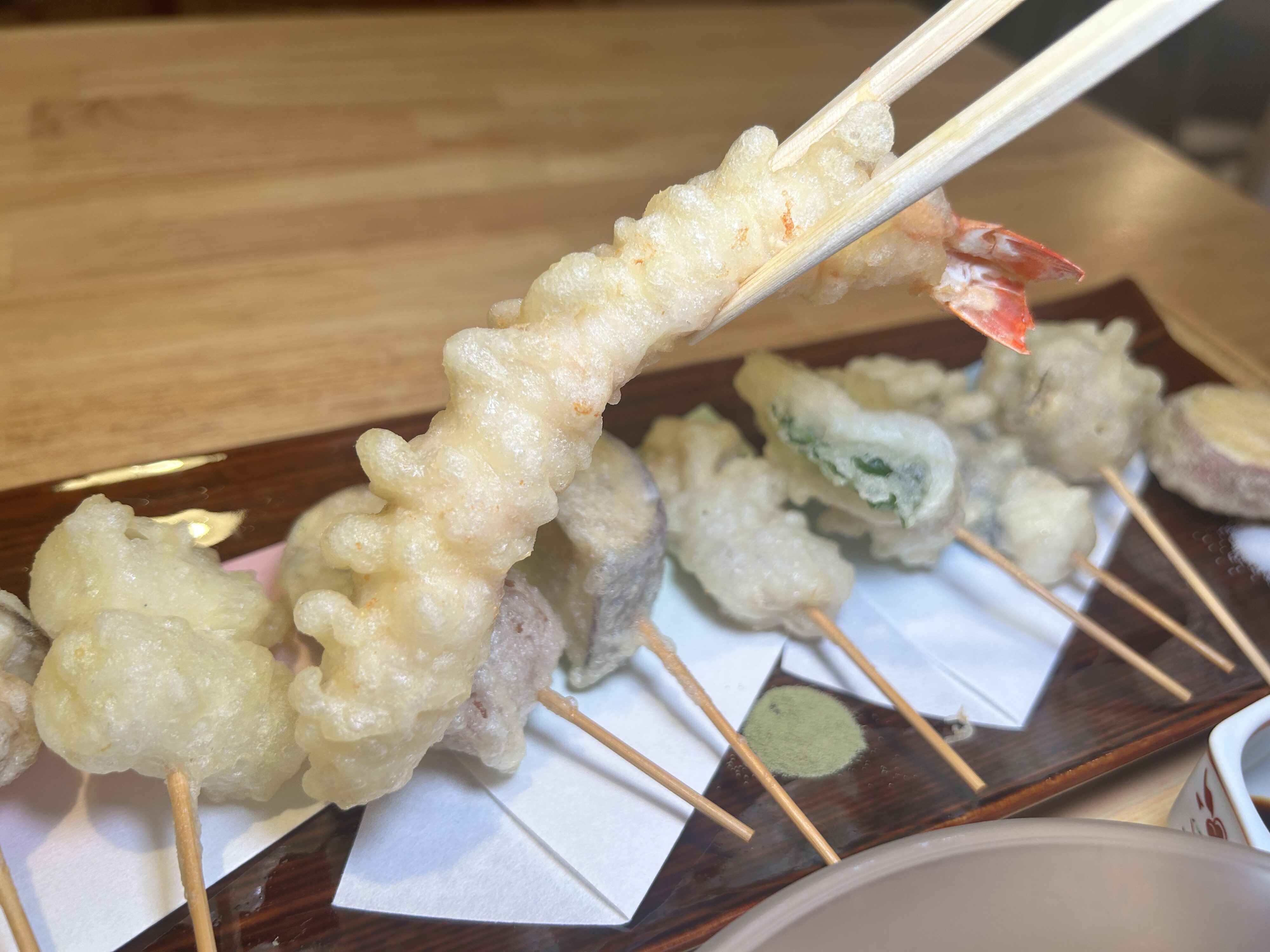 内容は、エビ・うずらベーコン・イカ・椎茸・白ネギ・ブラウンマッシュとシャウウェッセン・ナス・キスと大葉・小柱の磯辺巻き・さつまいも・豚バラチーズ・せせりとまるで“天ぷらのフルコース”のような豪華さ。