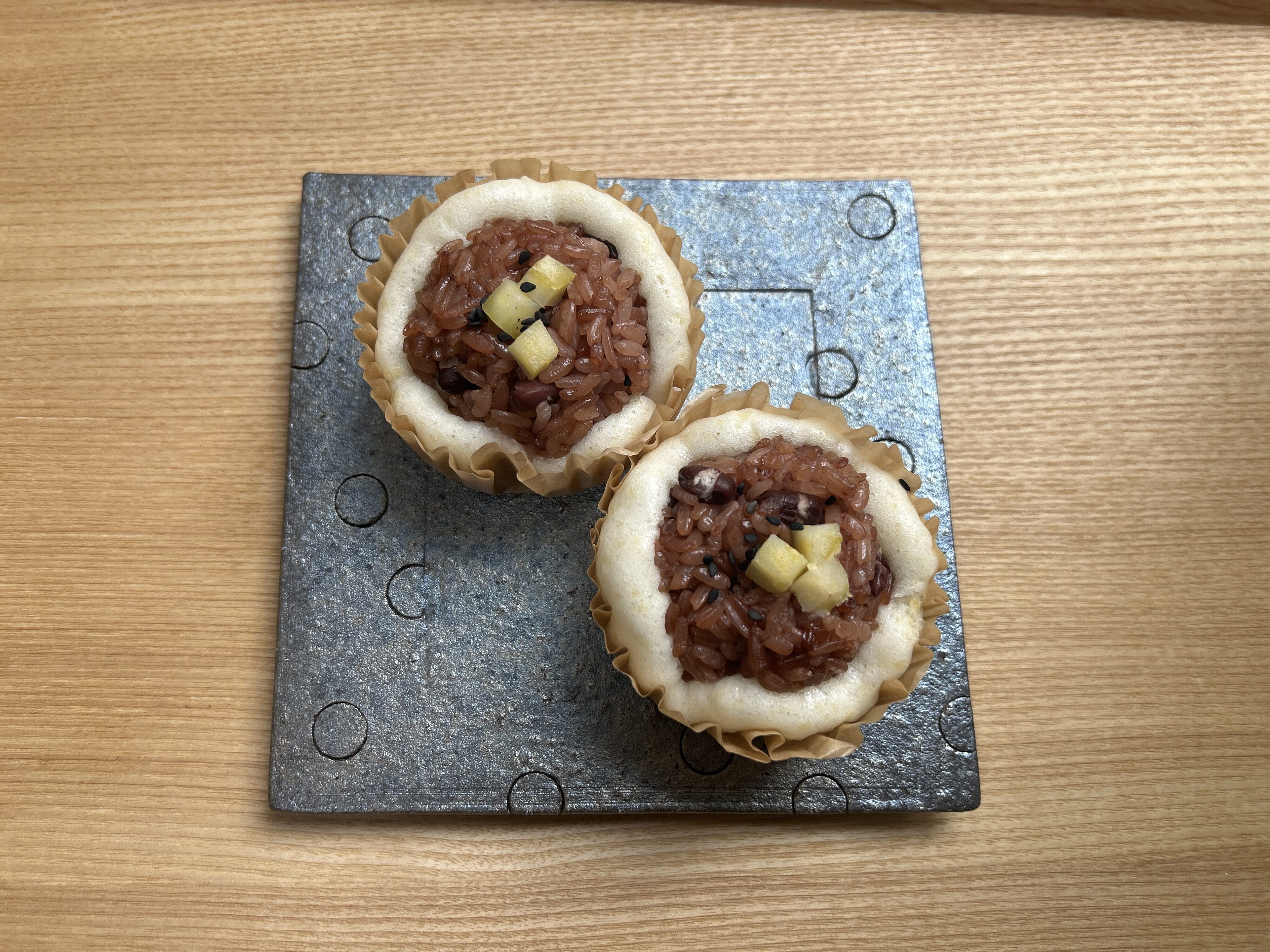 赤飯まんじゅう(2個入440円)は、甘めのふわっとした生地の中に、赤飯がぎっしり!