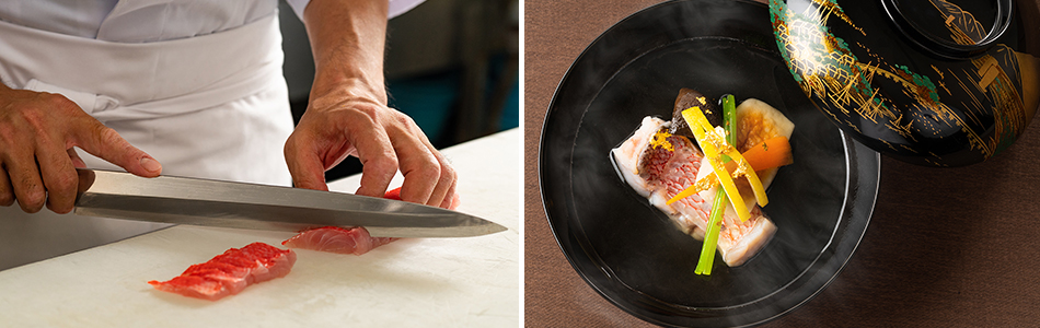 柚子味噌掛けの一品や、本日の鮮魚造り、公魚甘露煮、小巻玉子、小田巻蒸しなど、料理長の技が光る料理が少しずつ並びます。