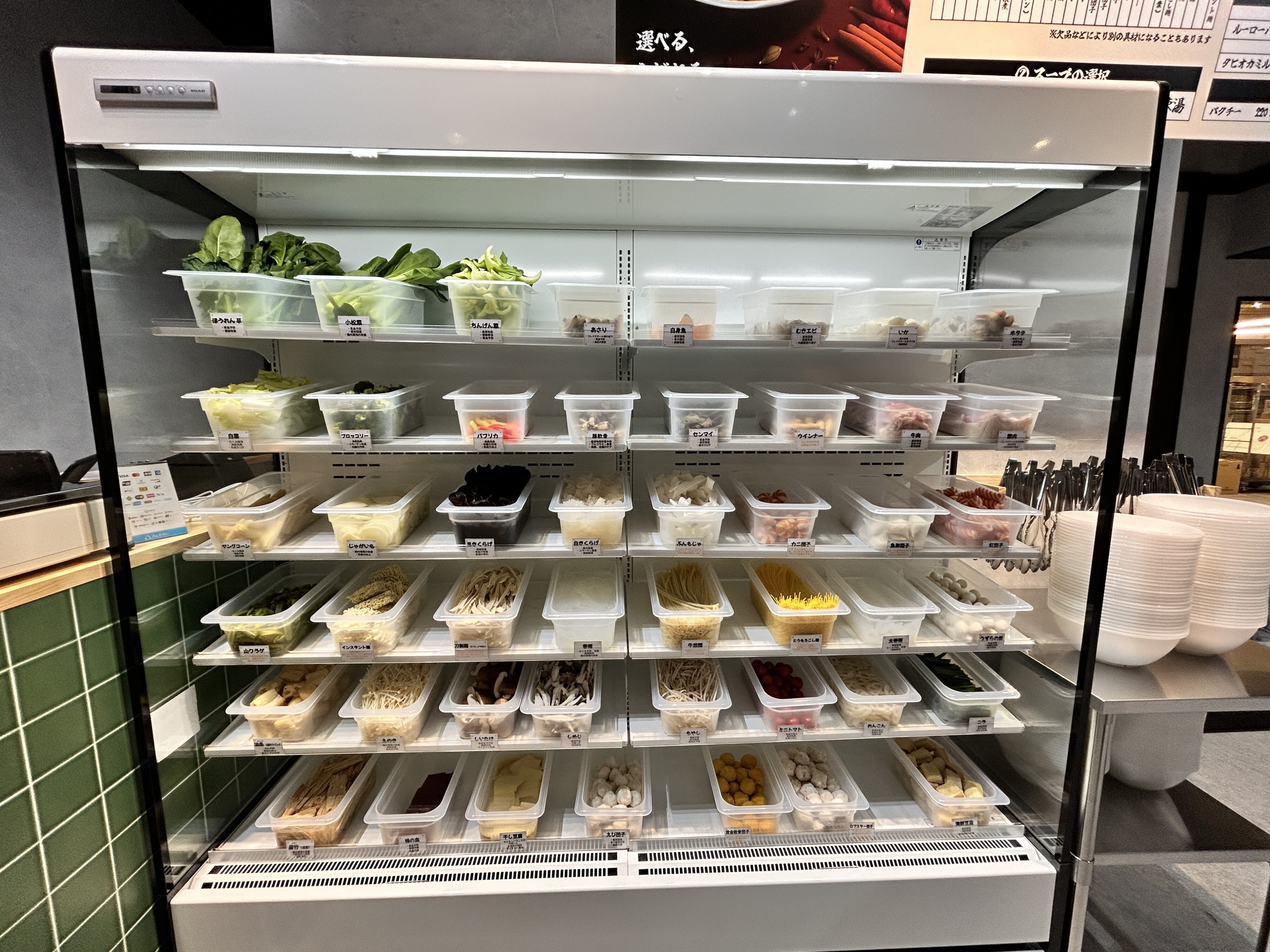 店内に入ってまず目を引くのが、ずらりと並ぶ具材ショーケース。野菜・海鮮・練り物・お肉など、具材は約50種類とかなり豊富!さらに麺は6種類から選べ、自分好みにカスタマイズできるのが魅力です。