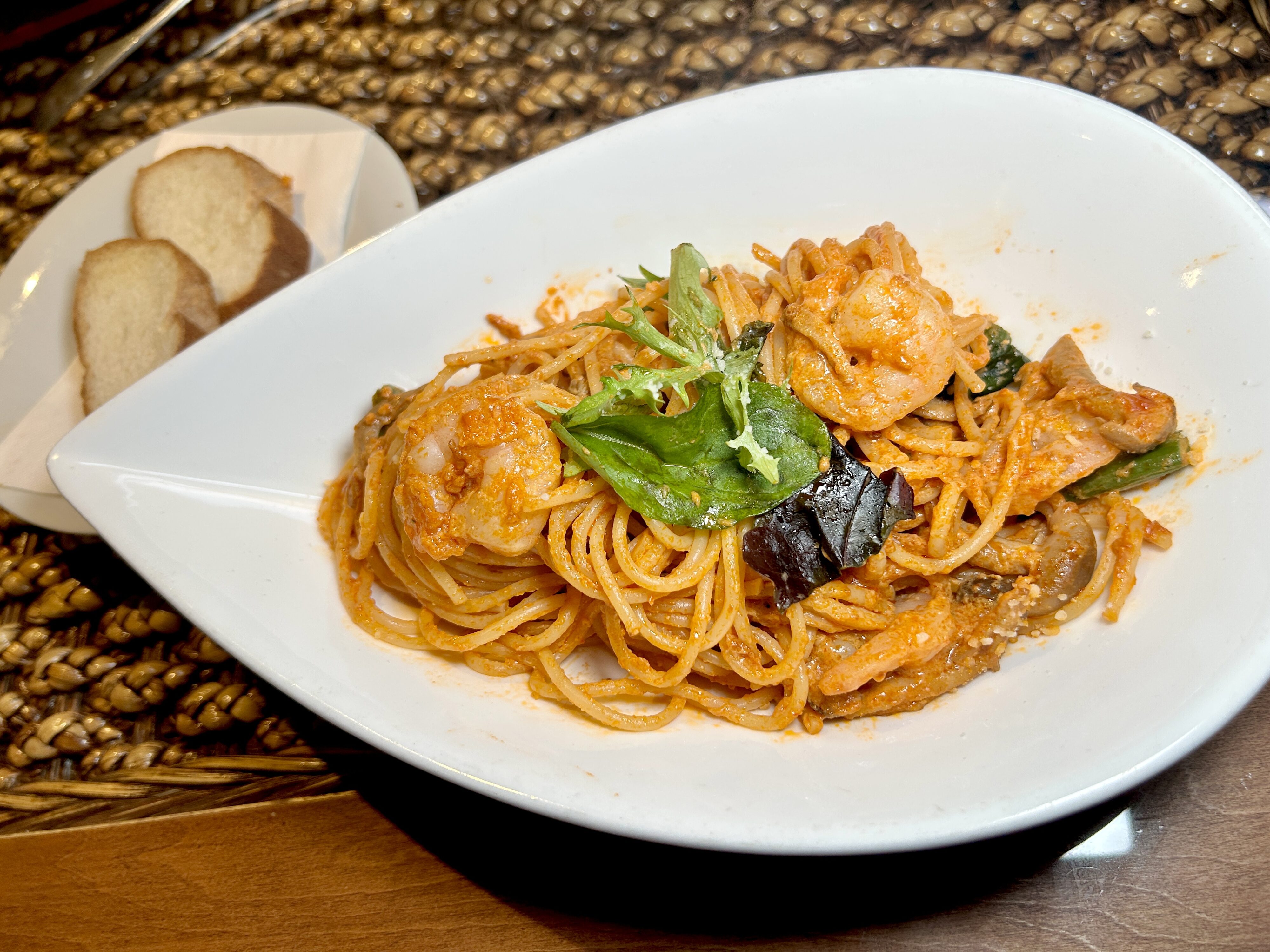 ぷりぷり食感の海老とごろっとお野菜がたっぷり。海老の旨みとトマトクリームのバランスが良く、コクがありながらも最後まで重たくならない一皿✨パスタ好きの方におすすめしたい逸品です。