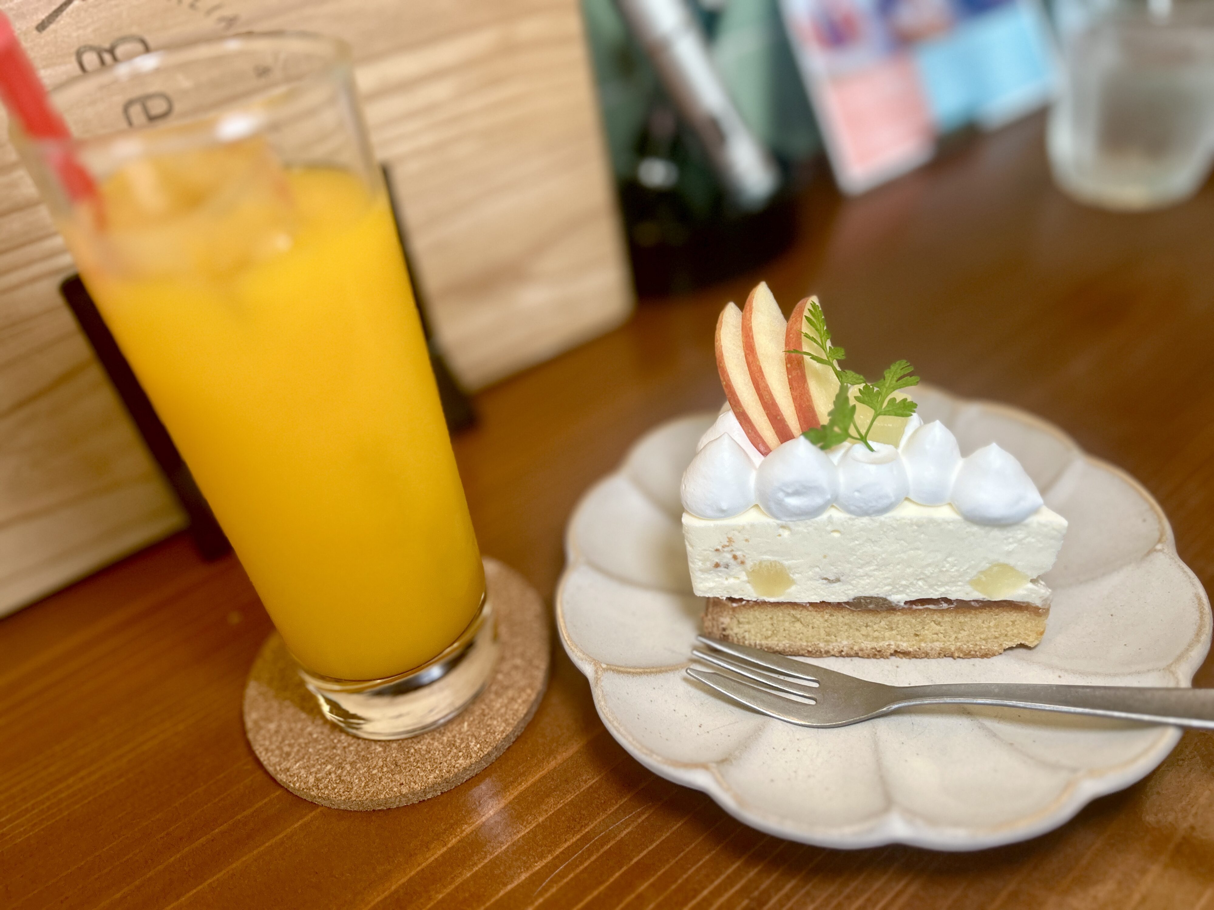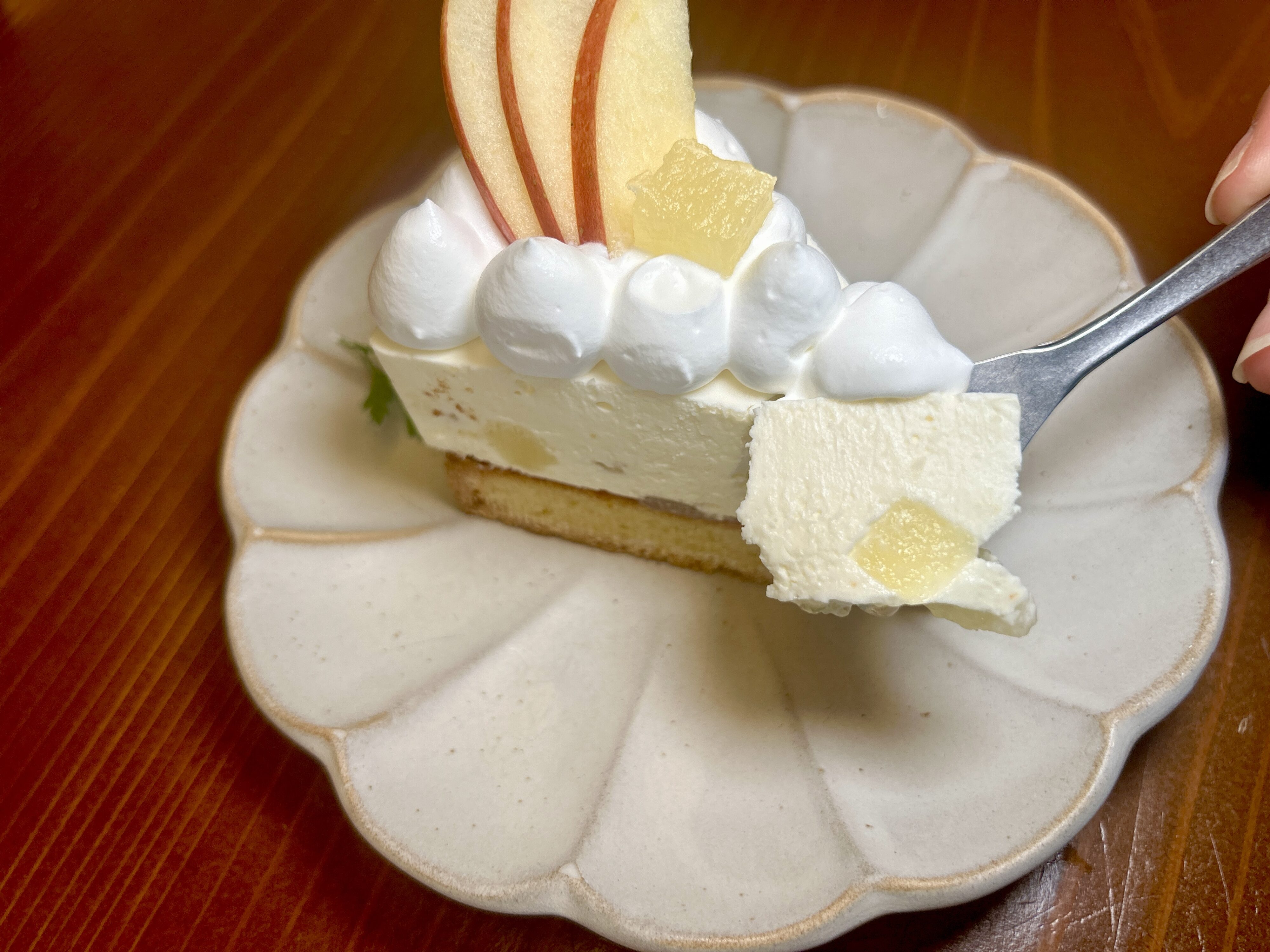 中には角切りのりんごが入っていて、シャキッとした食感が良いアクセントに。上の生クリームは甘さ控えめでケーキとは思えないほど軽い口当たり。