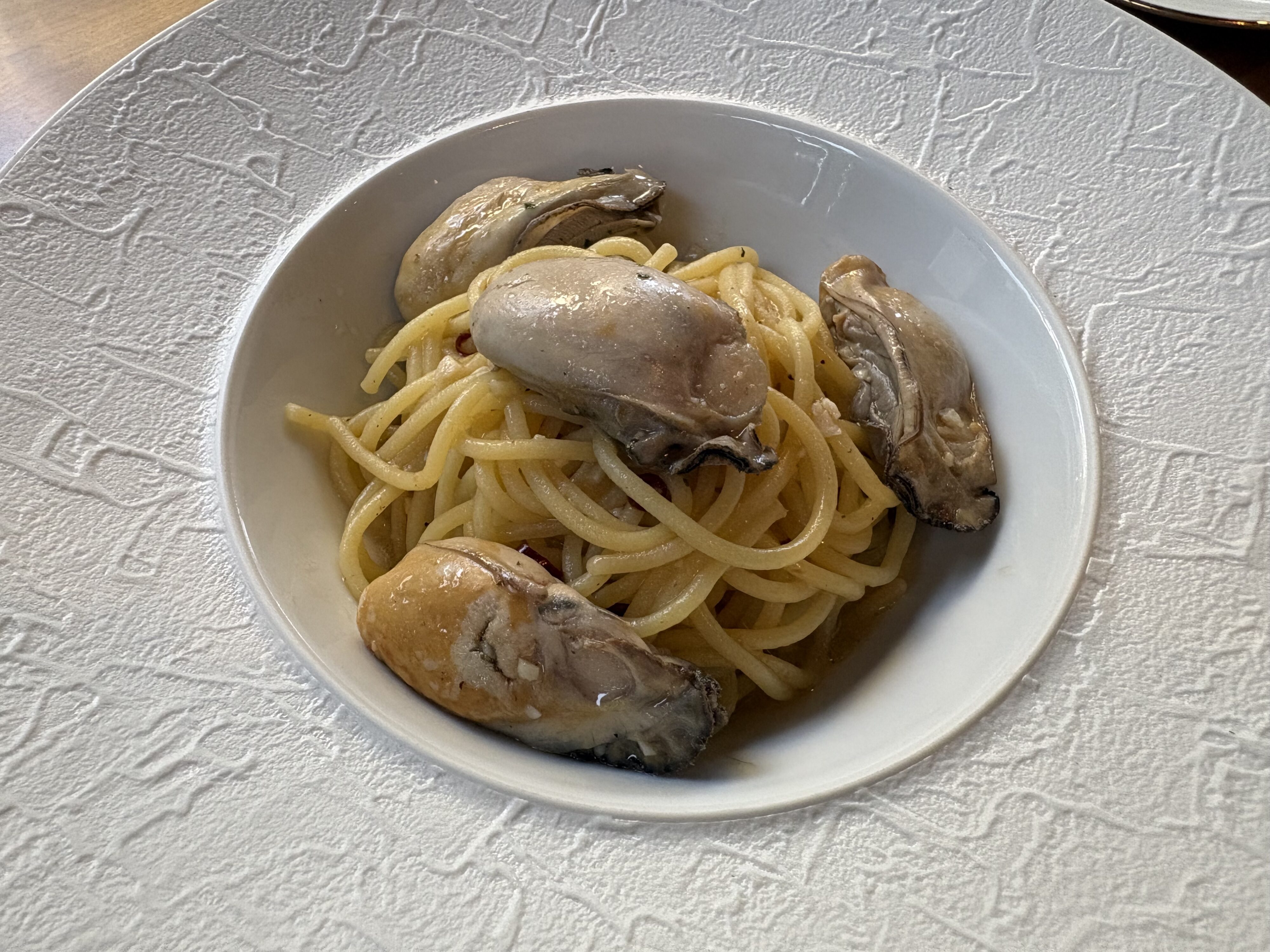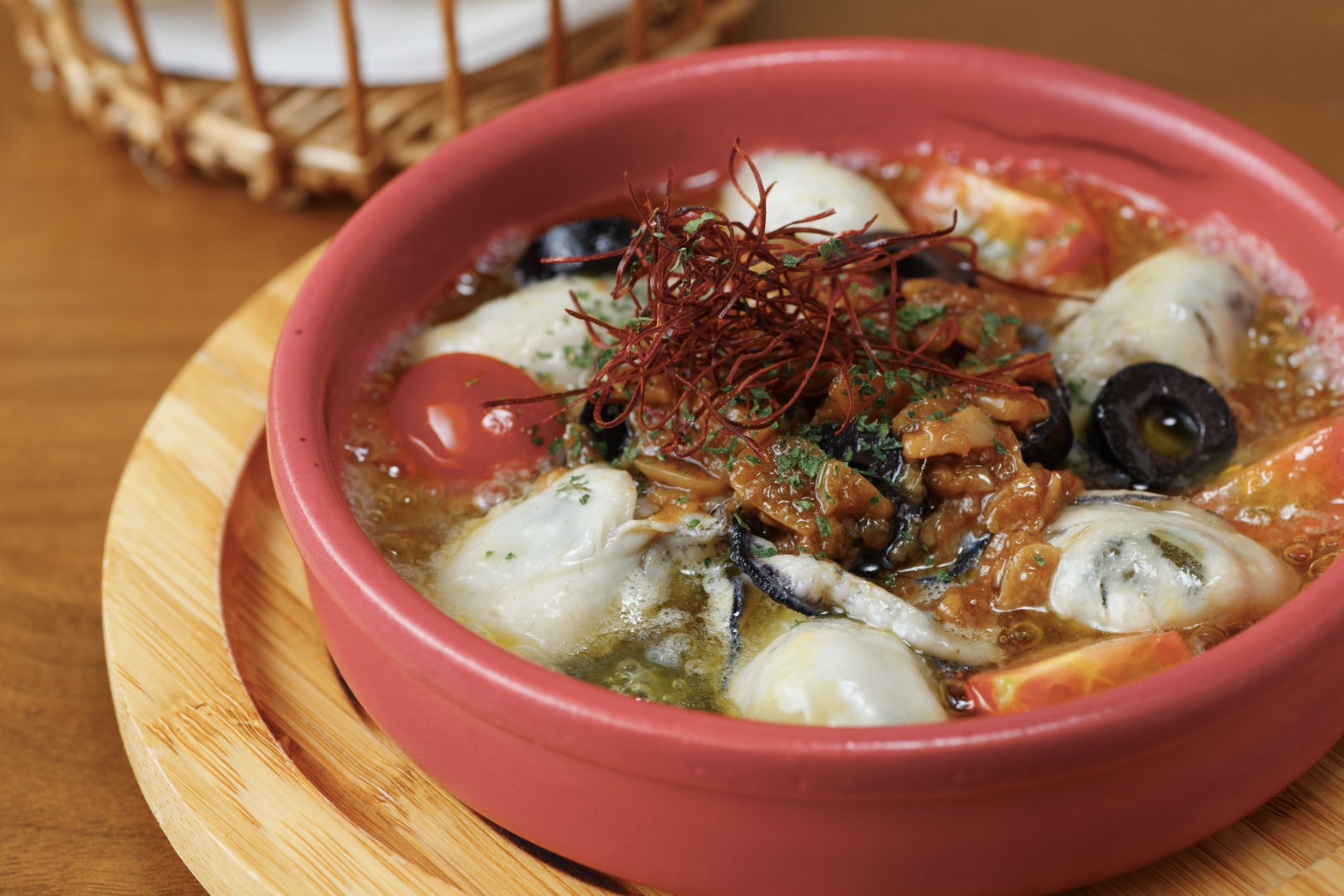 グツグツのオイルに牡蠣の旨みがしっかり溶け込んでいて、パンが止まらない一品。オリーブ、トマト、具材もしっかり入っていて満足度高め。