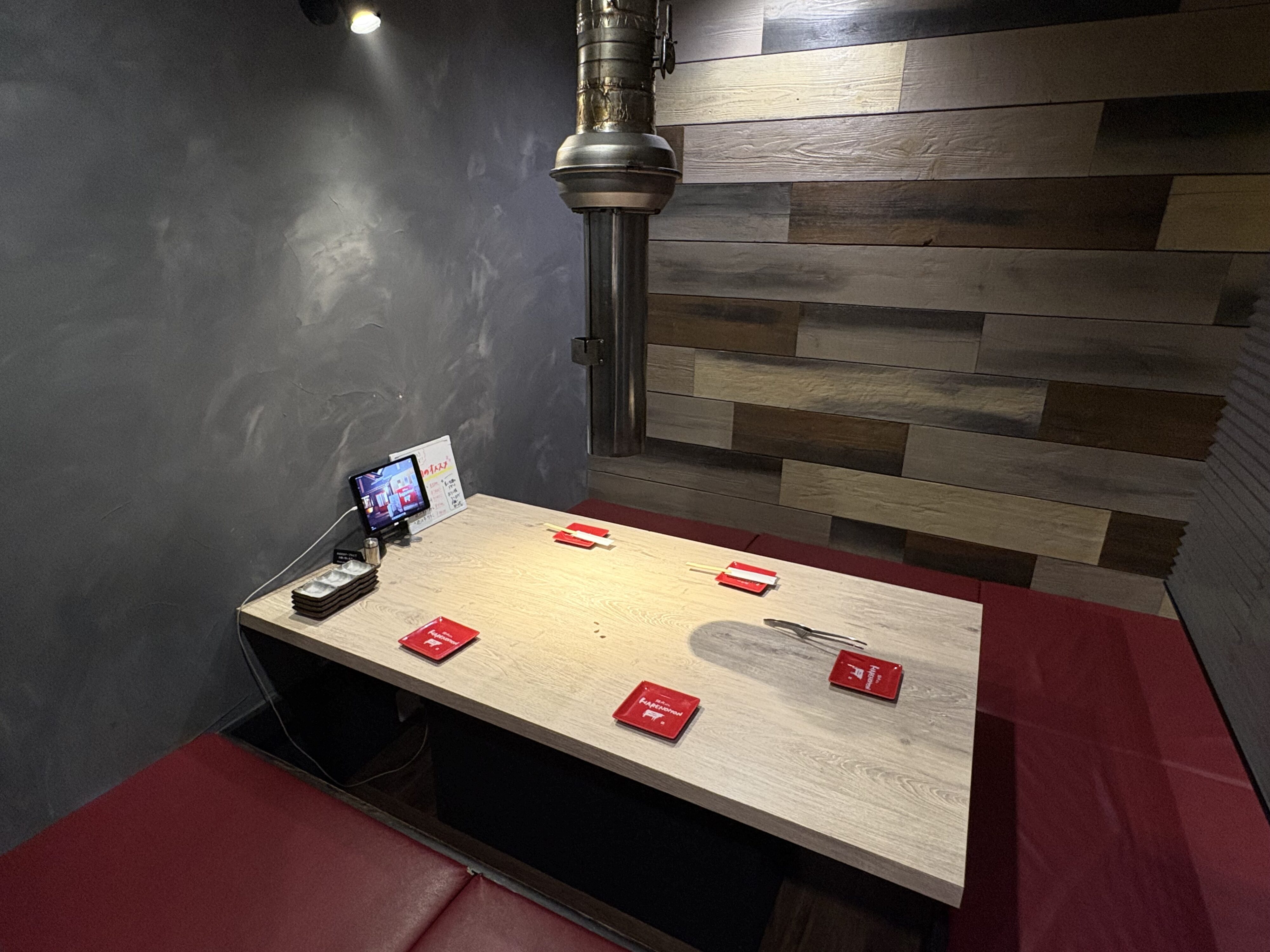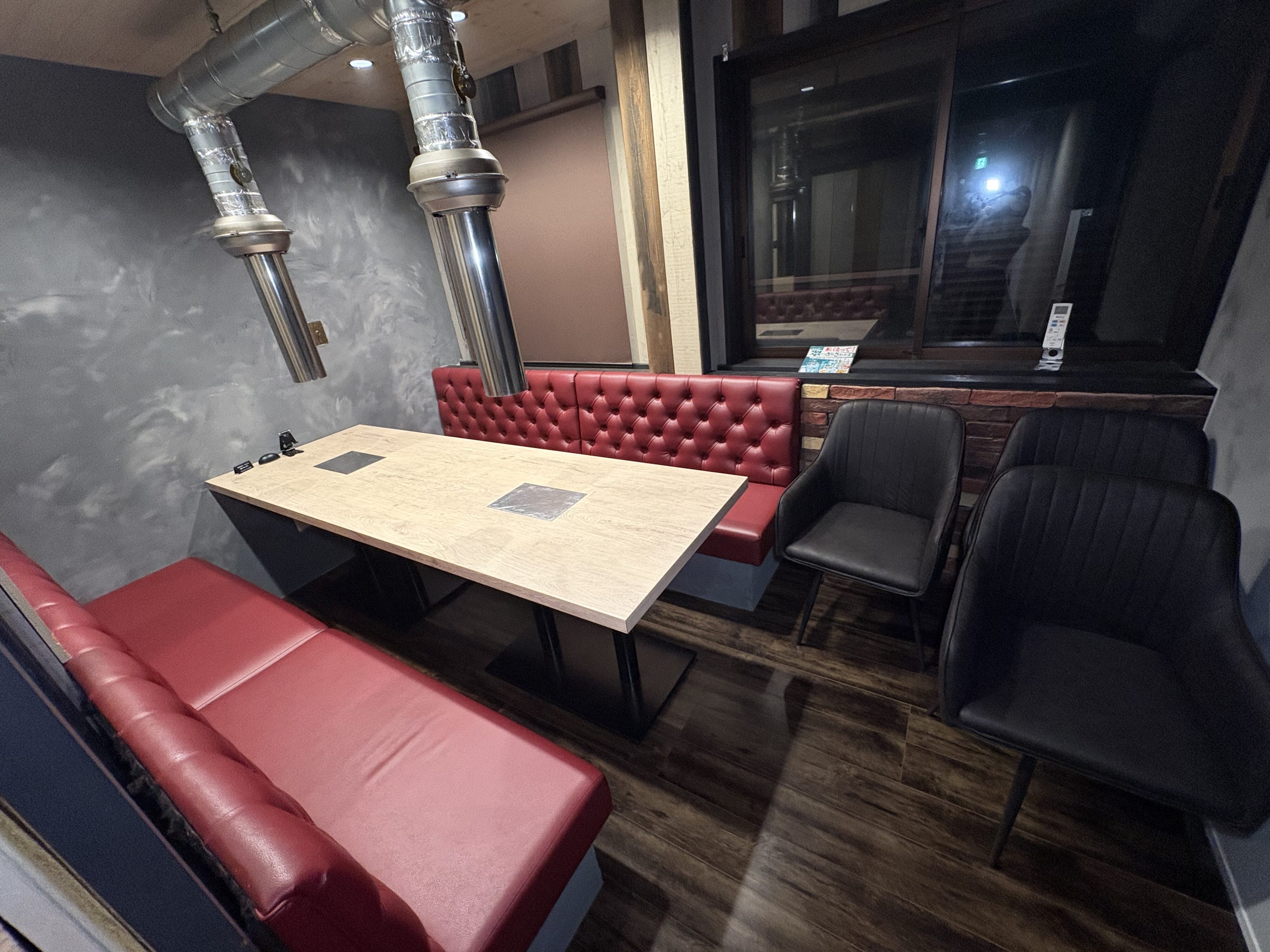 店内はシックでモダンな雰囲気。赤いソファが印象的な個室やカウンター席もあり、カップルからファミリー大人数の宴会まで対応可能です。駐車場も完備しているので、車での来店も安心です✨