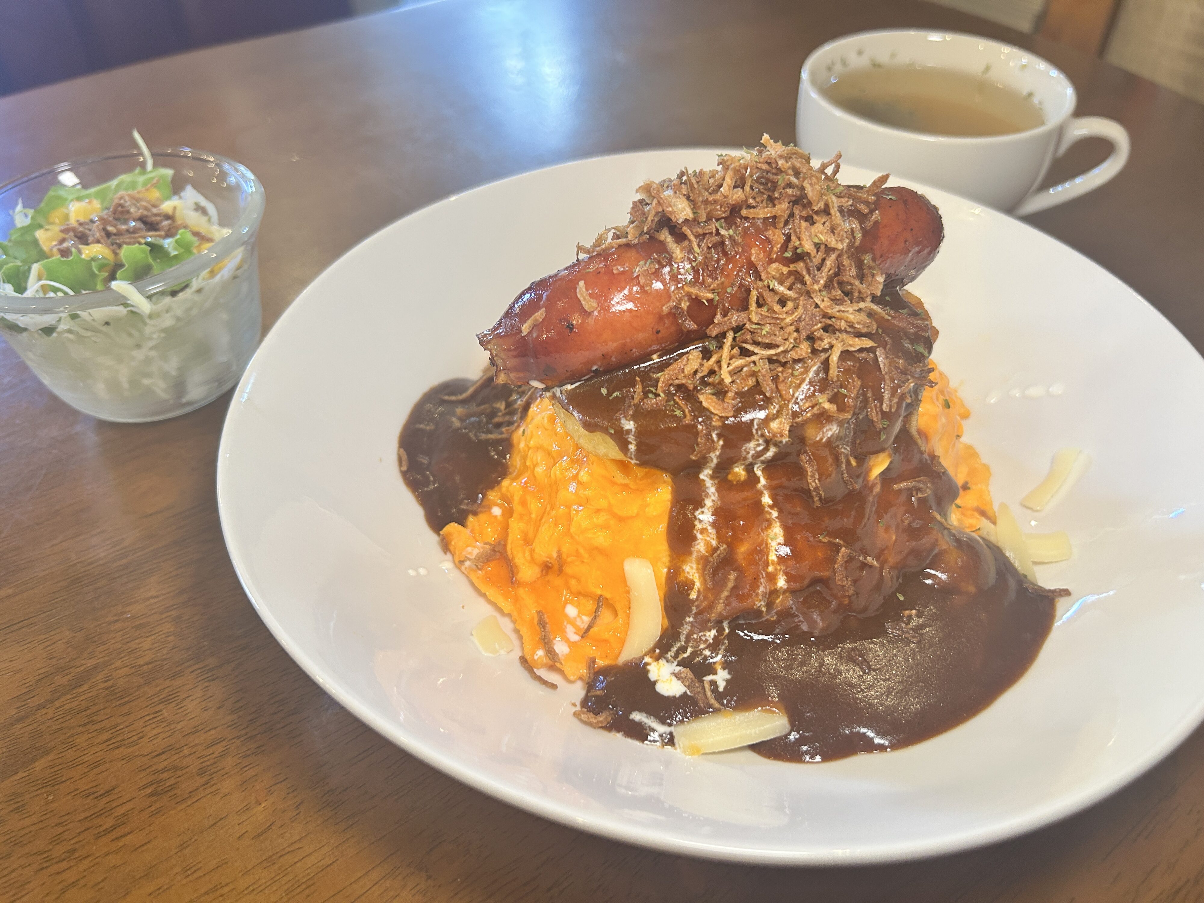 今回いただいたのは「アメリカンオムライス(1,480円)」。ジャンボソーセージ、ハッシュドポテトととろ〜りチーズが豪快に乗って仕上げは自家製デミグラスソース。使用している卵は濃厚でコクのある「蘭王」、お米は滋賀県産の「みずかがみ」を使用しており地元の味を大切にしたこだわりの一皿です✨ふわとろ卵と香ばしいデミソースソースの相性は抜群でまさに“食べ応え120%”の満足ランチです!ドリンク・サラダ・スープ付きでボリュームも満点!