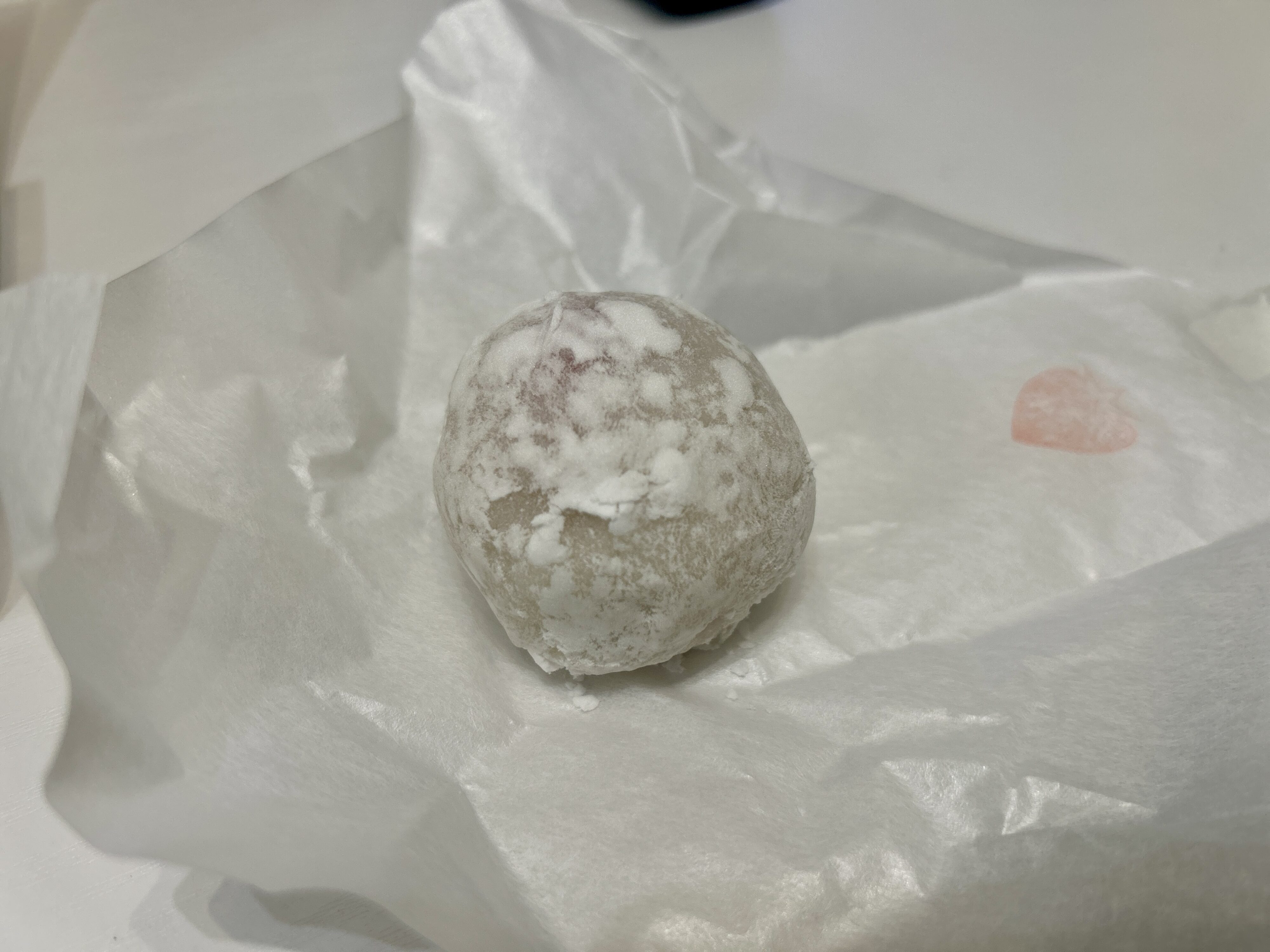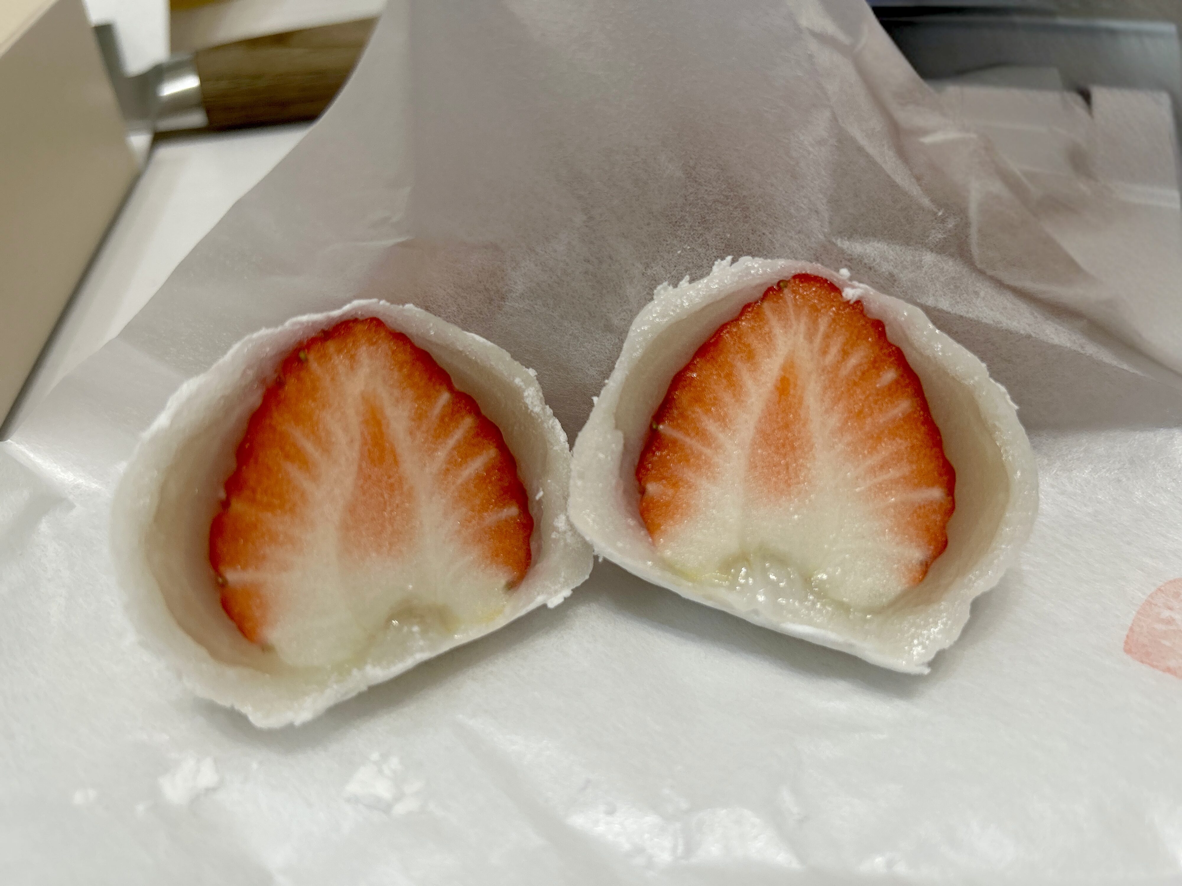 実際に食べてみると、まず驚くのが お餅の薄さ。薄めでやわらかいお餅の中に、大きくてみずみずしいいちごが丸ごと1粒 入っています。