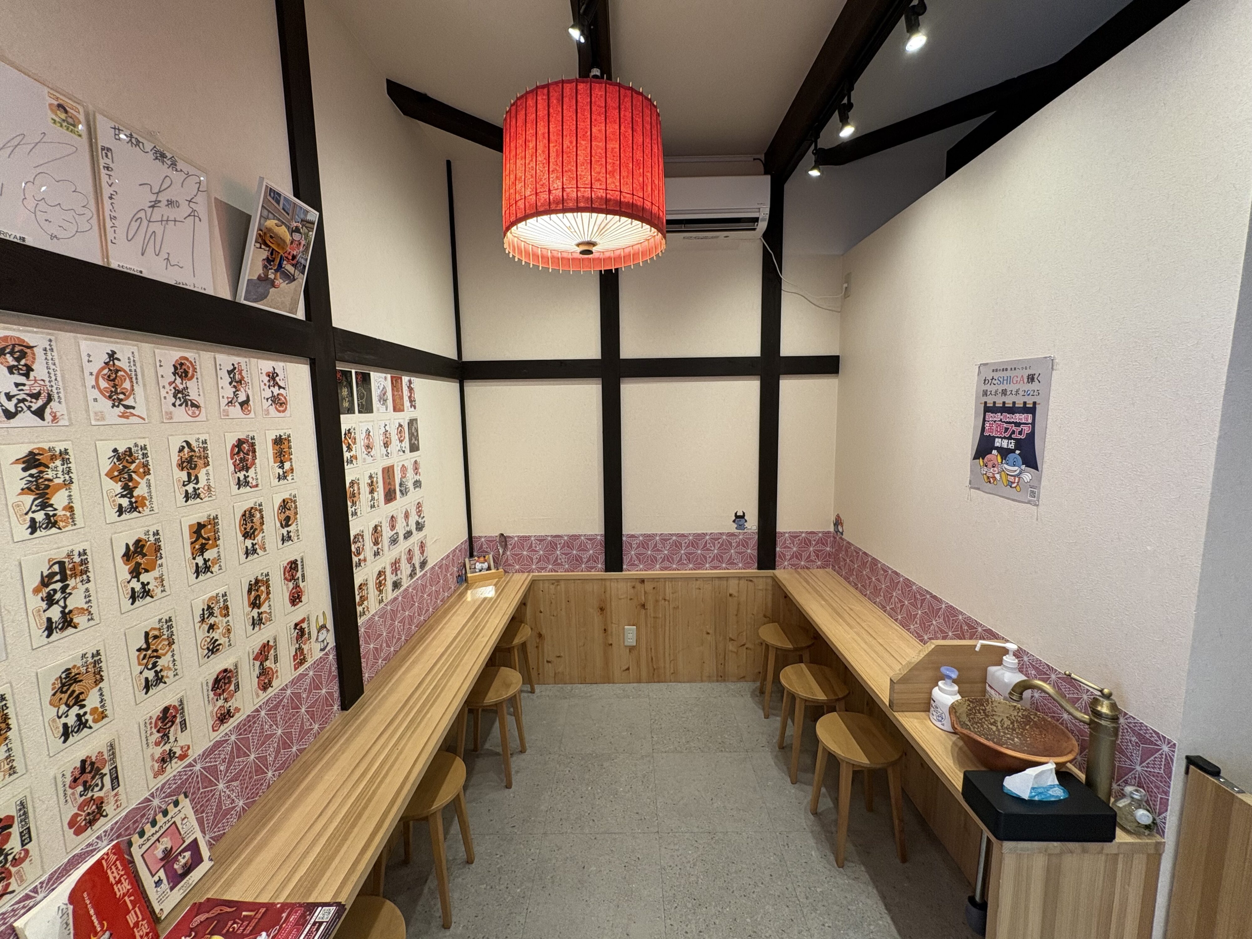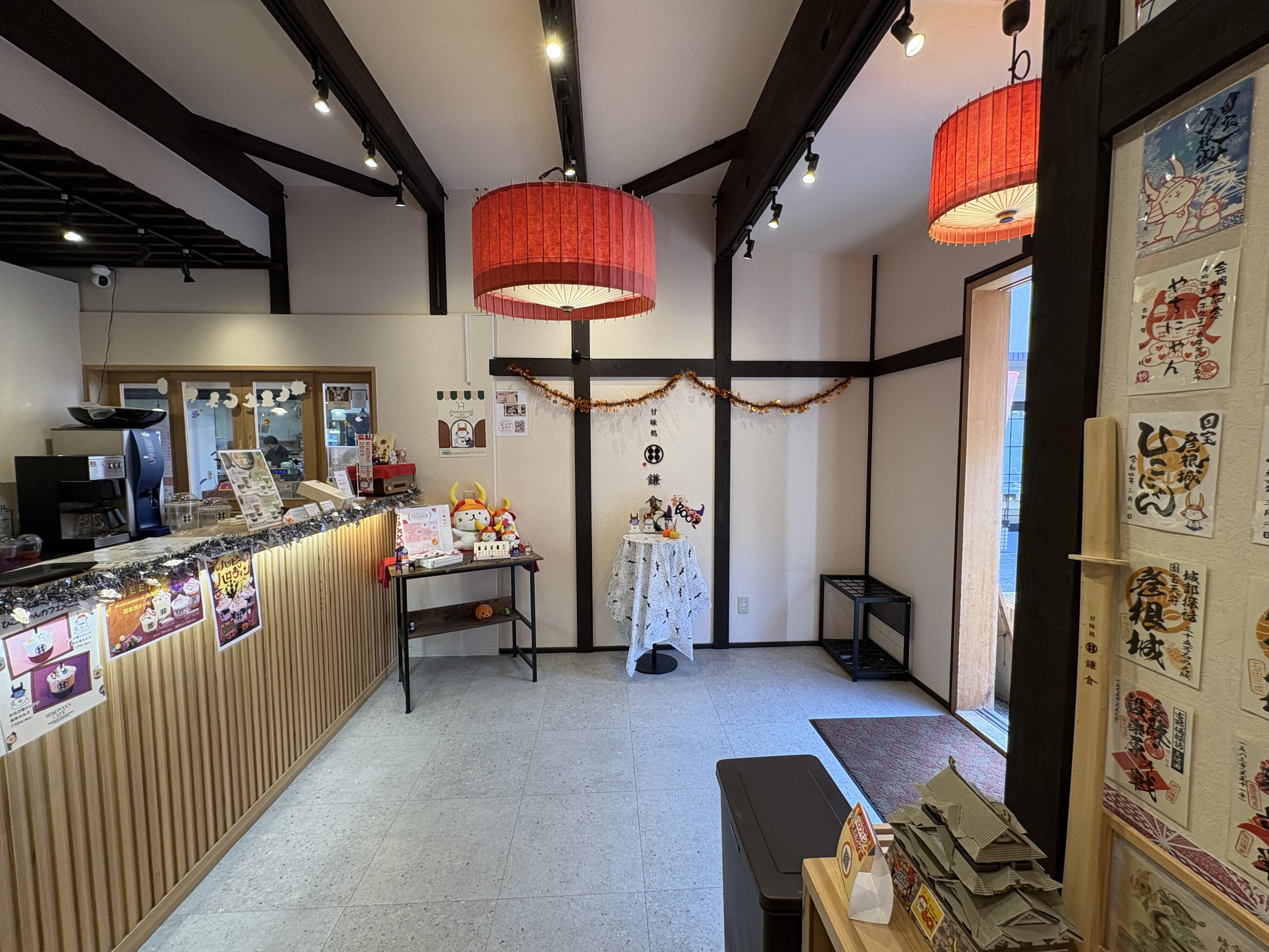 店内は落ち着いた和の雰囲気で、赤い傘をモチーフにした照明や、彦根ならではの“ひこにゃん”装飾もかわいらしいポイント♡