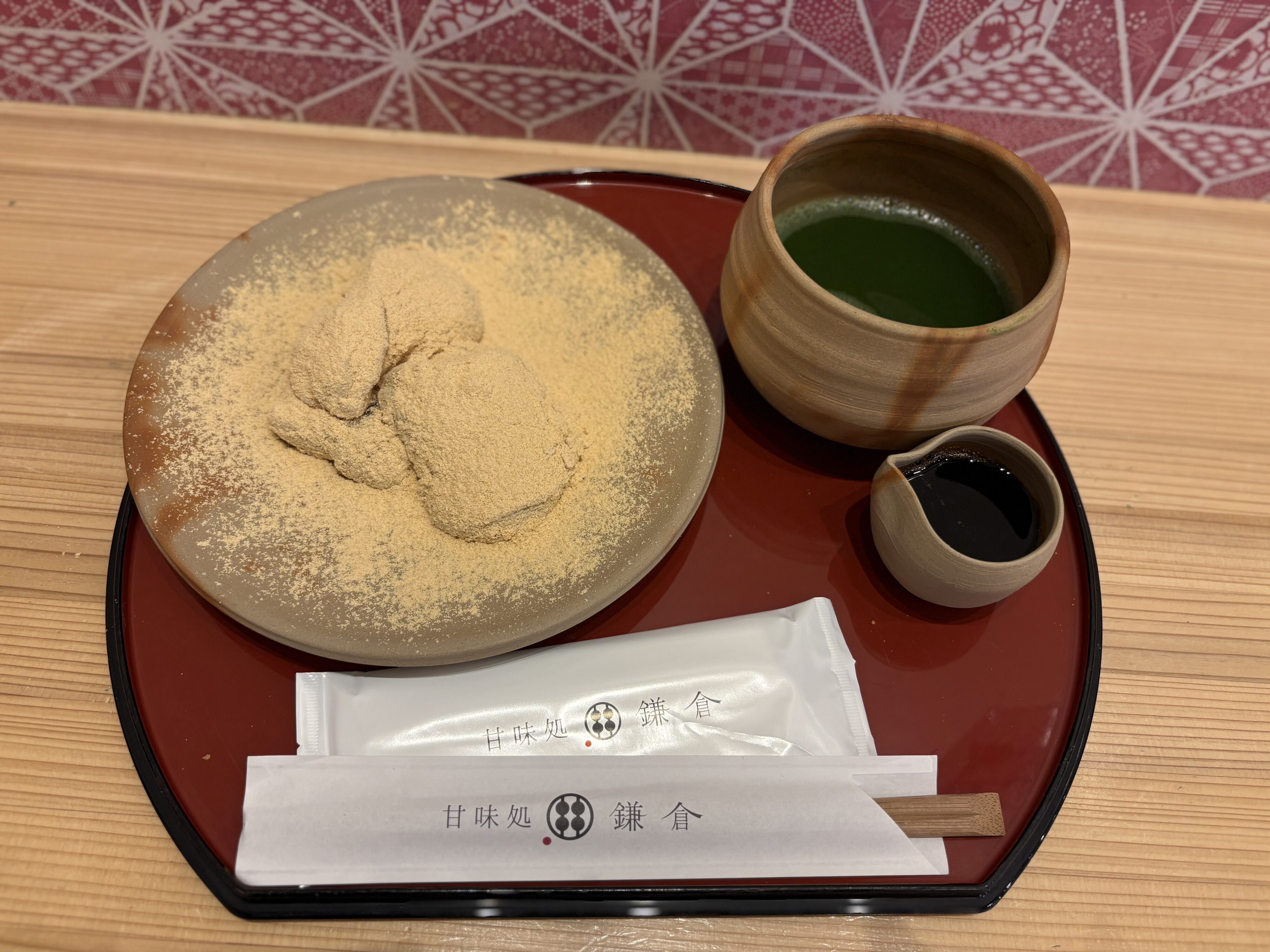看板メニューの「鎌倉わらび餅」は丁寧に練り上げられたぷるぷるの食感と、優しい甘さが特徴。黒蜜をかけると一層香ばしさが引き立ち、抹茶との相性も最高です✨5個入り(730円)、10個入り(1,400円)があり、贈答用の箱入りも用意されているのでお土産にもおすすめ!