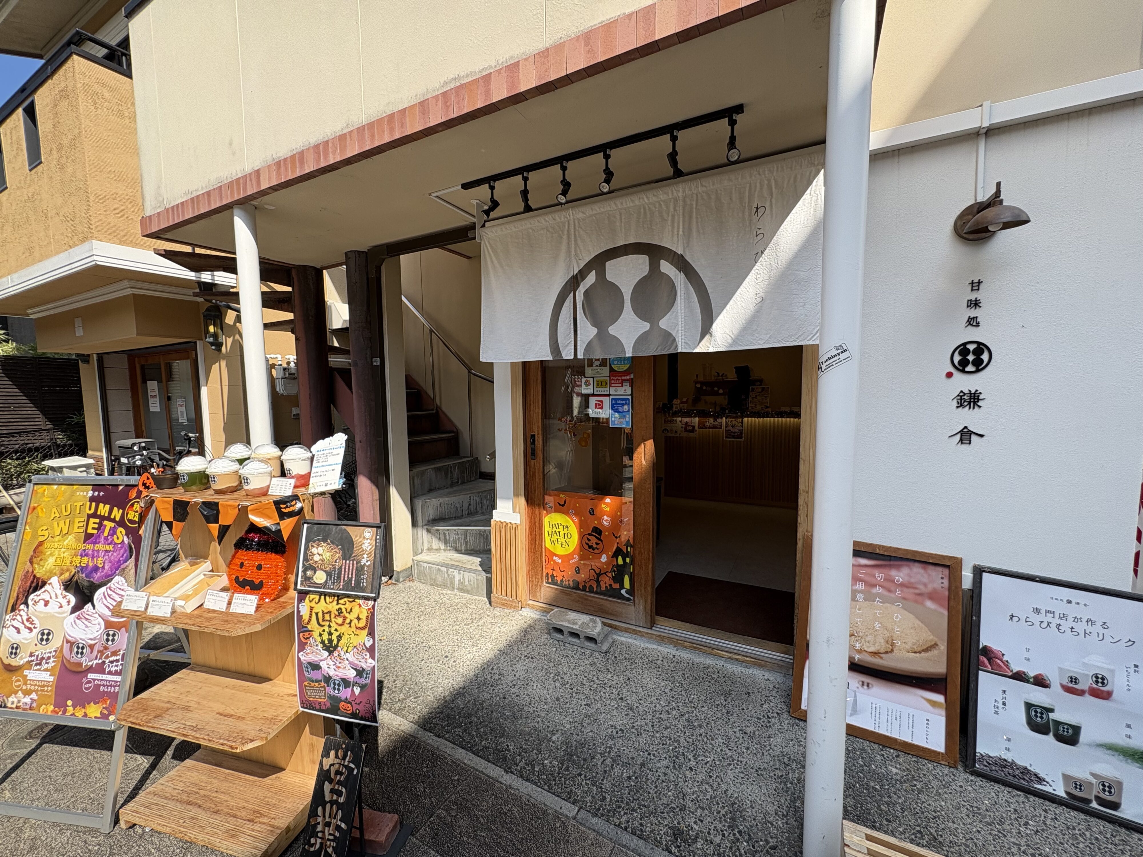 彦根城近く、四番町スクエアにある人気店「甘味処 鎌倉 彦根城四番町スクエア店」城下町の情緒あふれる通りに佇むお店で、店頭には職人さんが切り立てのわらび餅を試食させてくれるなど、観光の合間に立ち寄る人で賑わいます。