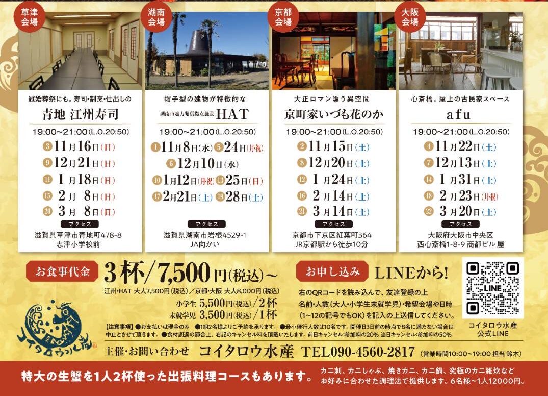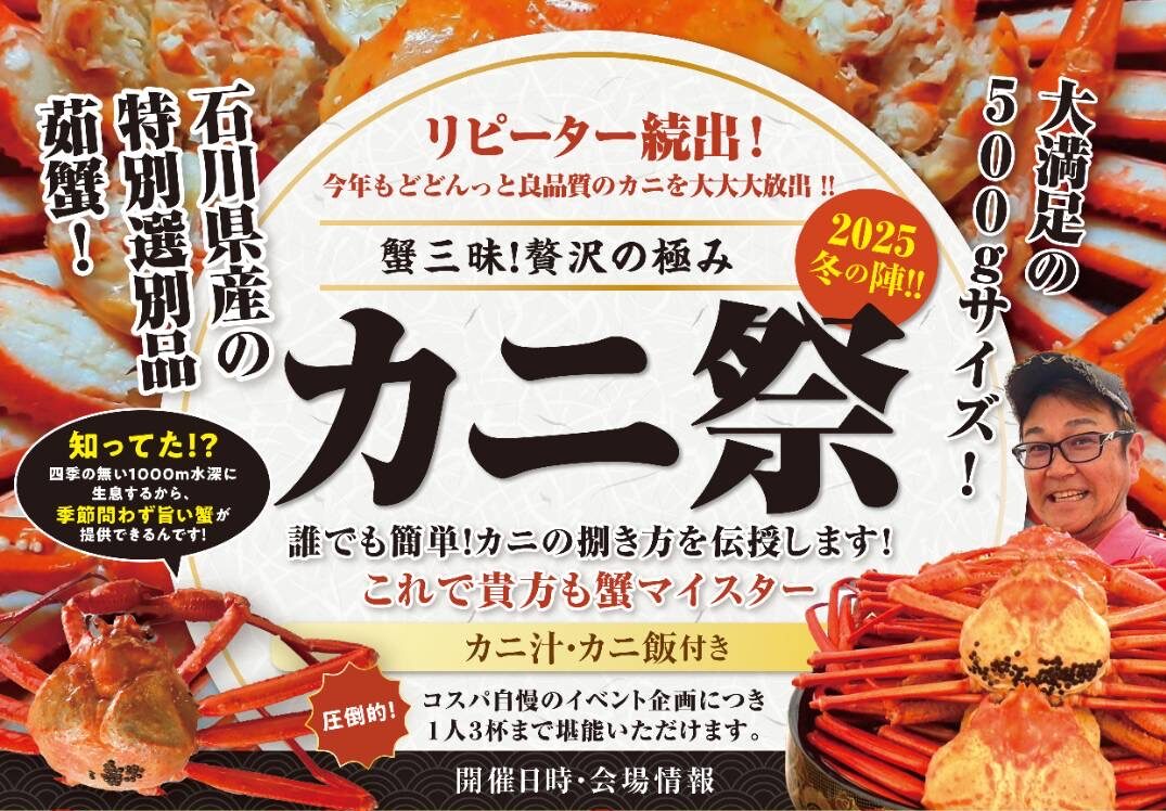 お待たせしました!毎回チケット完売&大盛況の「カニ祭り」が11月8日(土)〜滋賀・京都・大阪にて開催いたします!前回参加できなかった方もチャンスですよー!