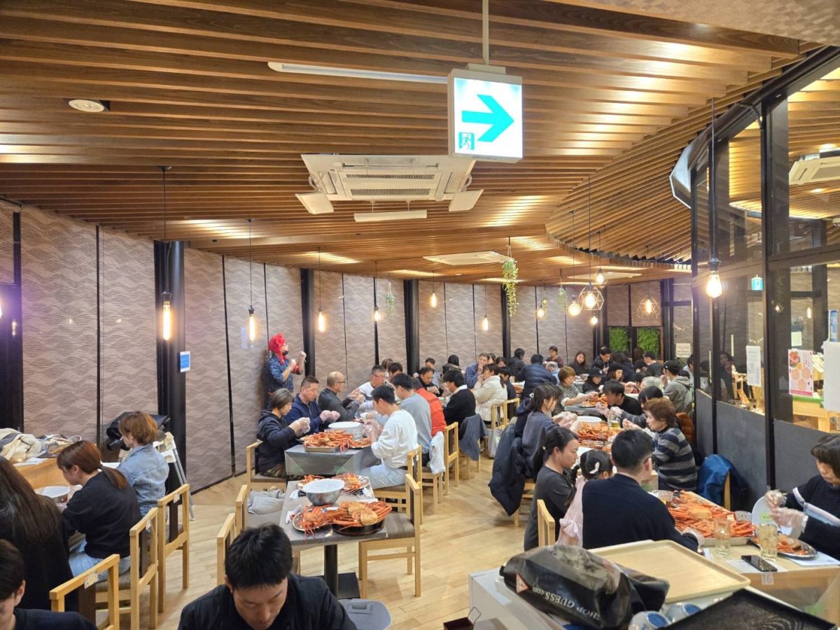広々とした空間で、家族や友人、カップルなど幅広い世代がカニを囲んで楽しむ光景が広がります✨