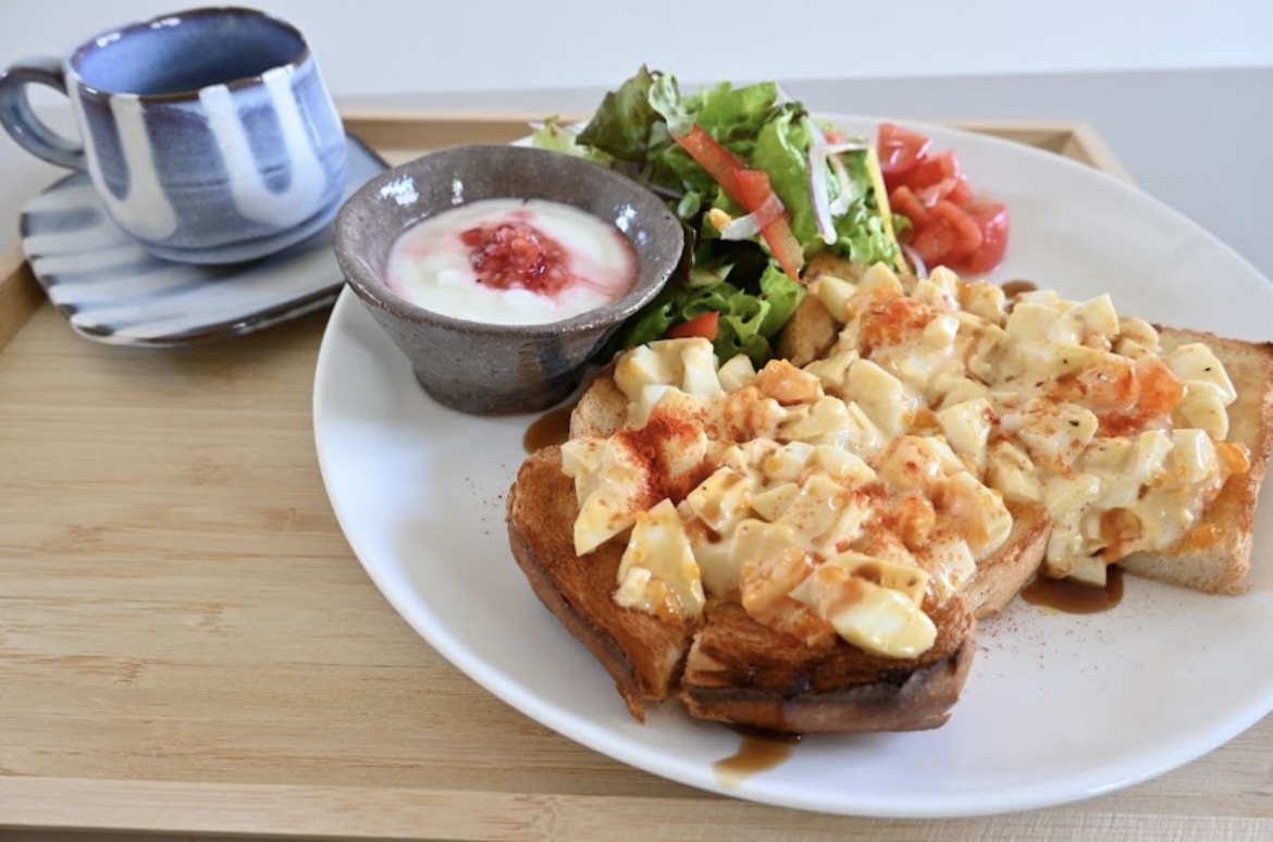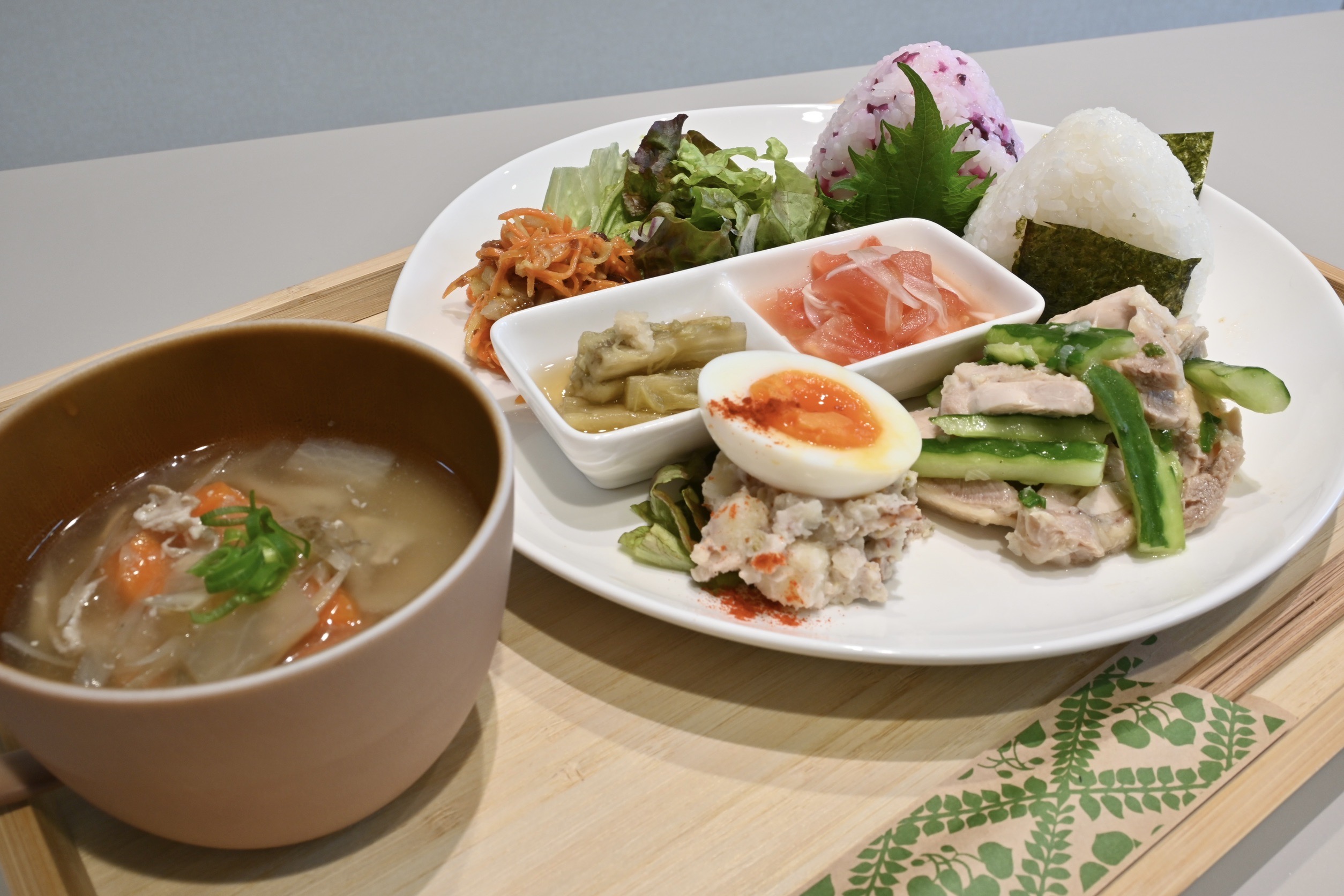 ランチタイムの人気メニュー「おにぎりプレート」は彩り豊かなおにぎりと副菜、具沢山味噌汁がセットになった体に優しい一皿。滋賀県産の新鮮野菜を使った副菜はどれも丁寧な味付けでほっとする美味しさ。他にもパスタランチなどカフェらしい洋食メニューも楽しめます♡