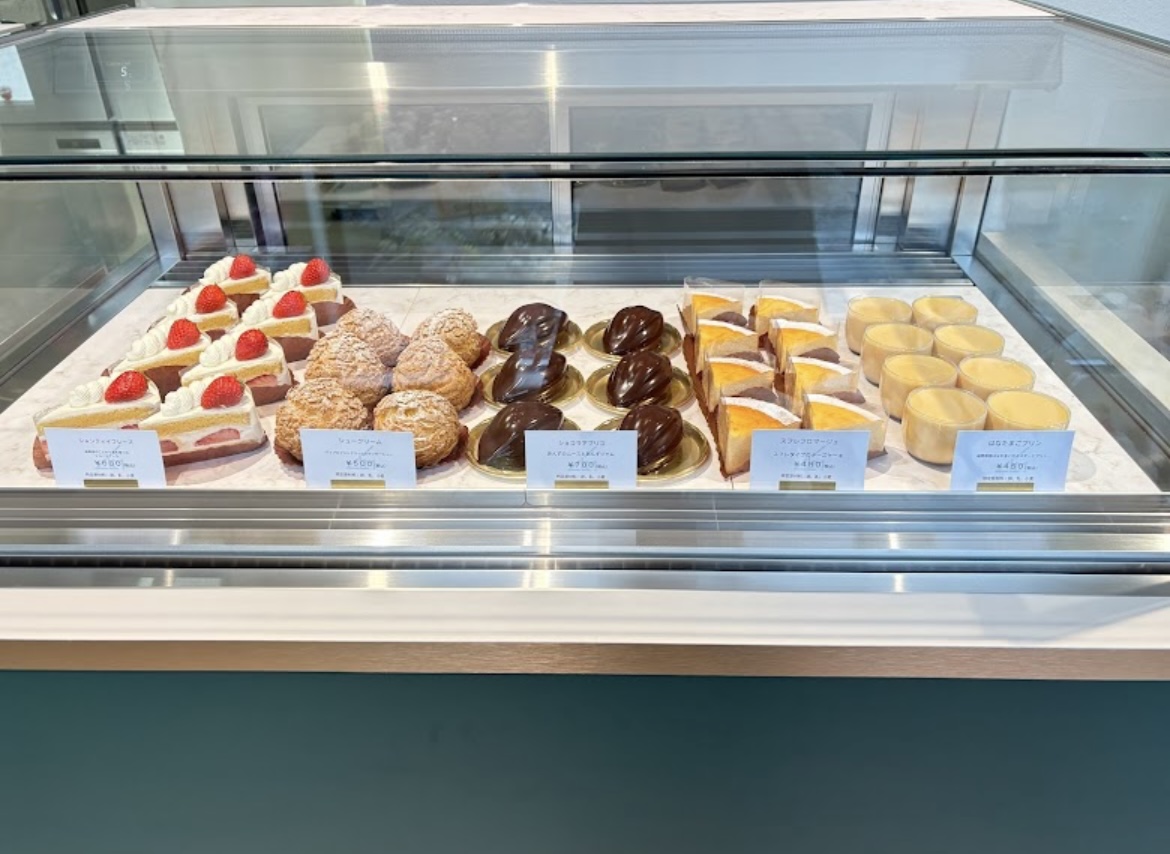 ショーケースには、「苺のショートケーキ」や「シュークリーム」「プリン」の王道ケーキがずらり。