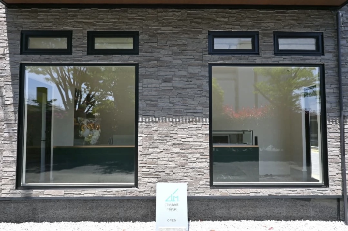 外観はの石壁に大きな窓が印象的。店内は白と木目を基調にしたミニマルなデザインで明るく開放的な雰囲気。スイーツを選ぶ時間も、ランチをいただく時間も特別なひとときを味わえます✨
