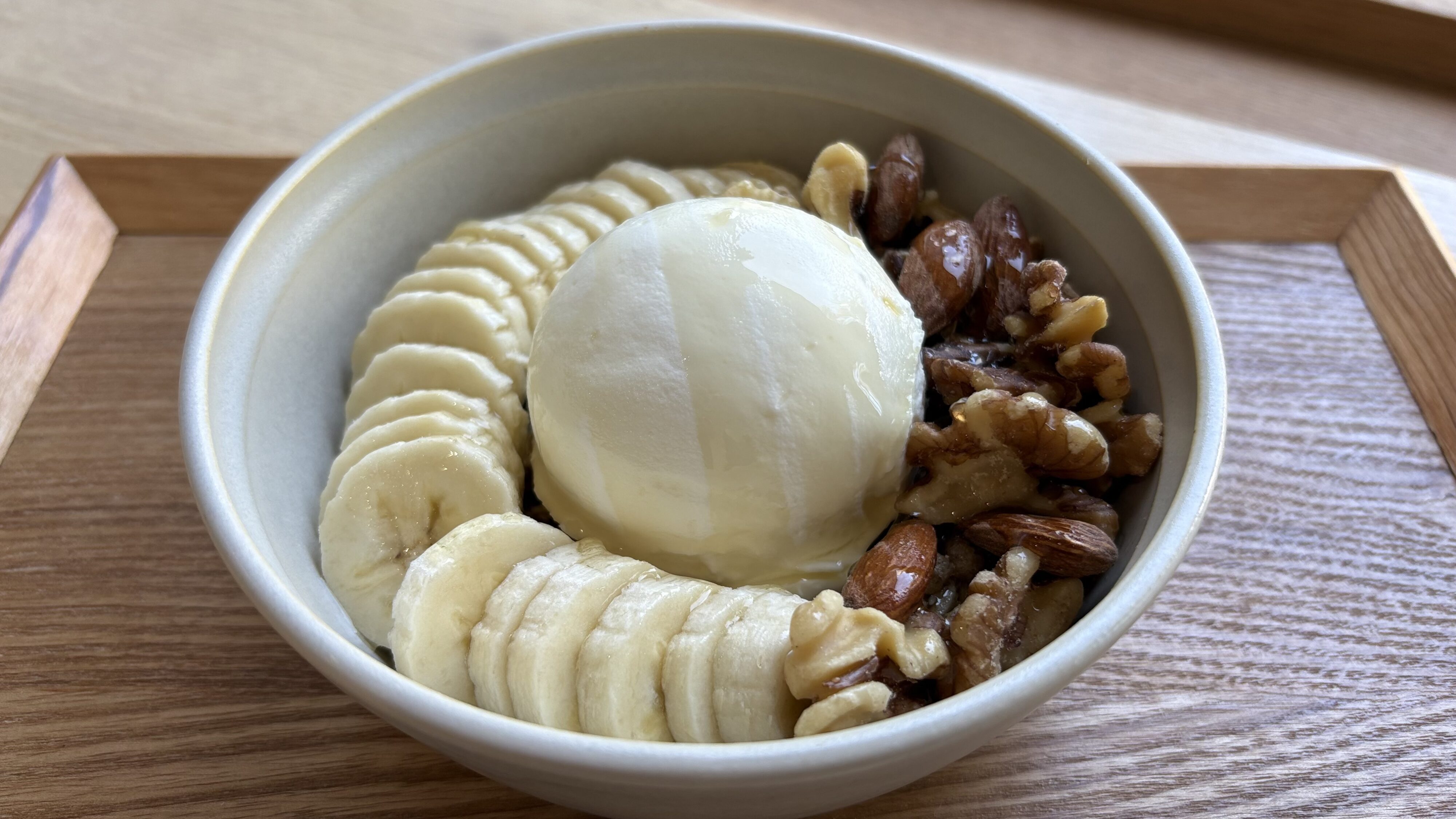 バナナのグリークヨーグルトはヨーグルトもバナナ味でした。水切り時間に時間までこだわったグリークヨーグルトをベースに、アベガシロップやナッツを合わせた一品で、ヘルシーかつ満足感たっぷり。