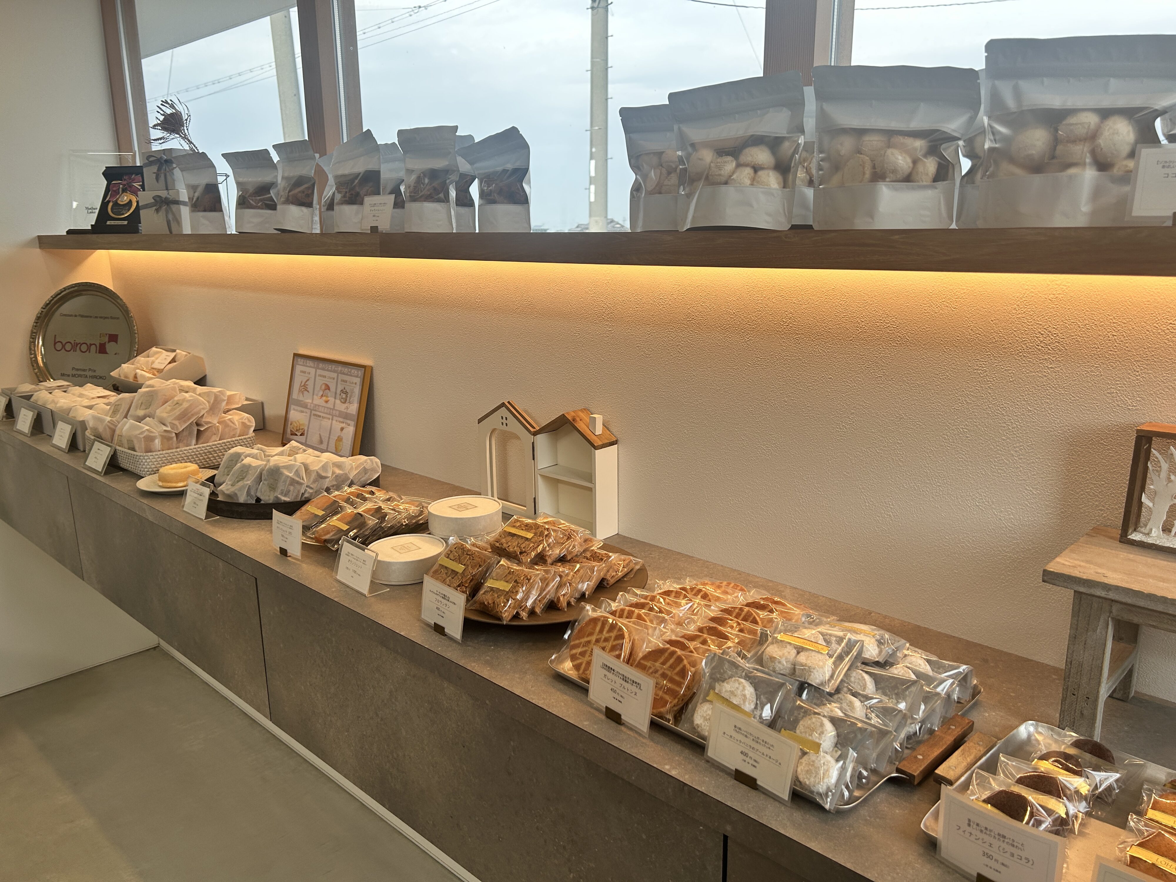 人気商品の「ロハシエ・リング」から「スコーン」、棚にはロハシエドーナツ、フィナンシェ、ブールドネージュなどがずらりと並び、パッケージもシンプルでかわいく、センスの良さを感じます。