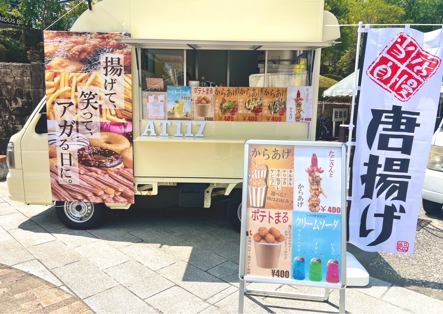 唐揚げ・ポテトまる・クリームソーダなど、子供に大人気のラインナップ。黄色のトラックが目印で、写真映えフードも多数!!