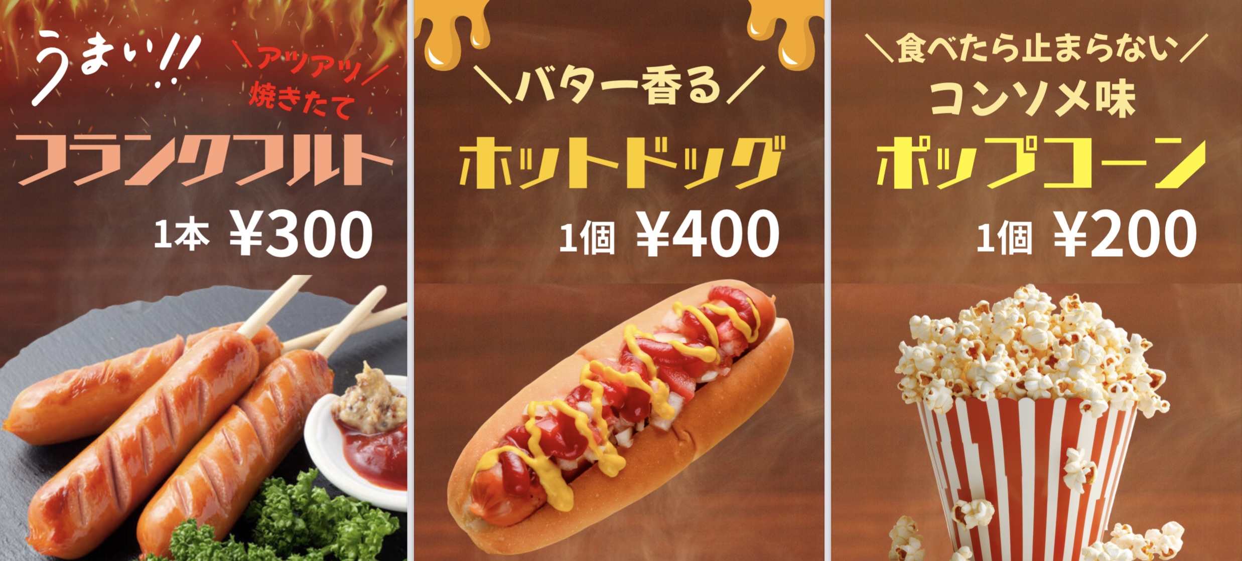 ・フランクフルト・ホットドッグ(20個限定)・ポップコーン