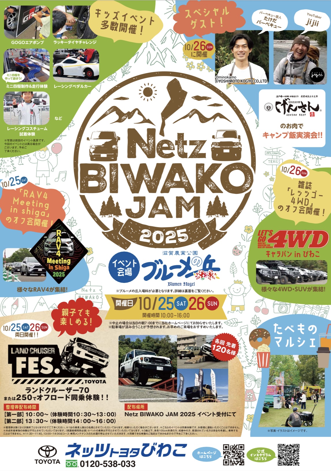 子どもたちが楽しめるキッズイベントやワークショップ、地元の人気店が集まる「たべものマルシェ」、そしてアウトドア好き必見のスペシャルゲストによるキャンプ飯実演会も開催。NANGAのダウンシュラフ体験や話題のキャンピングカー展示、SUVのオフロード同乗試乗体験「ランドクルーザーフェス」など、クルマとアウトドアを存分に楽しめる内容が勢揃いします!さらに10月25日(土)には「RAV4 ミーティング」、26日(日)には「LET’S GO 4WDキャラバンinびわこ」も同時開催され、様々な4WD・SUVが集結!車好きも大満足間違いなしです😆!