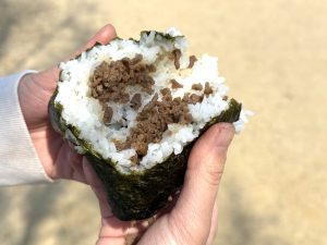 握りたてなので、ホカホカ。そしてサイズはコンビニのおにぎりと比べても一回りほど大きい。