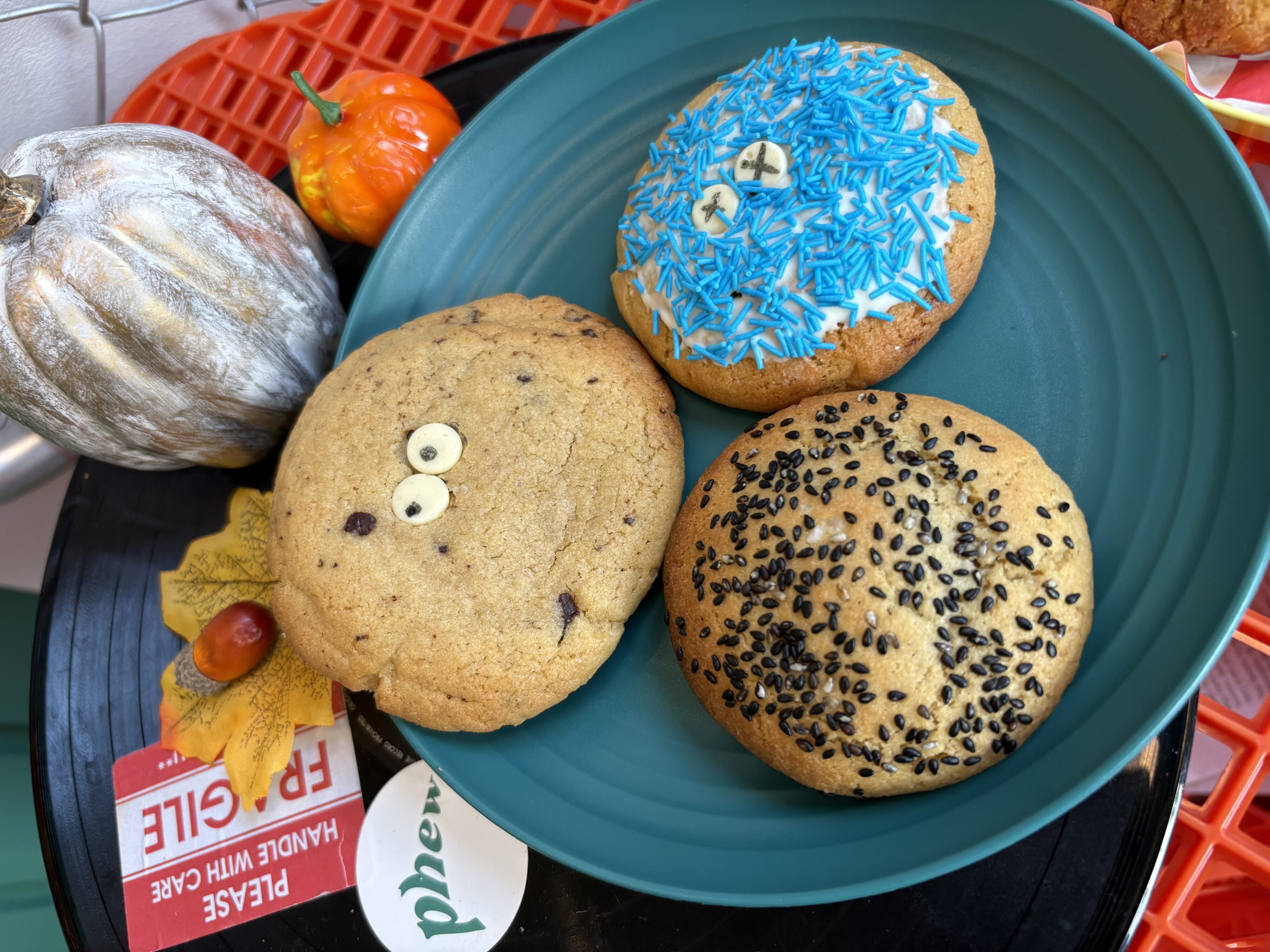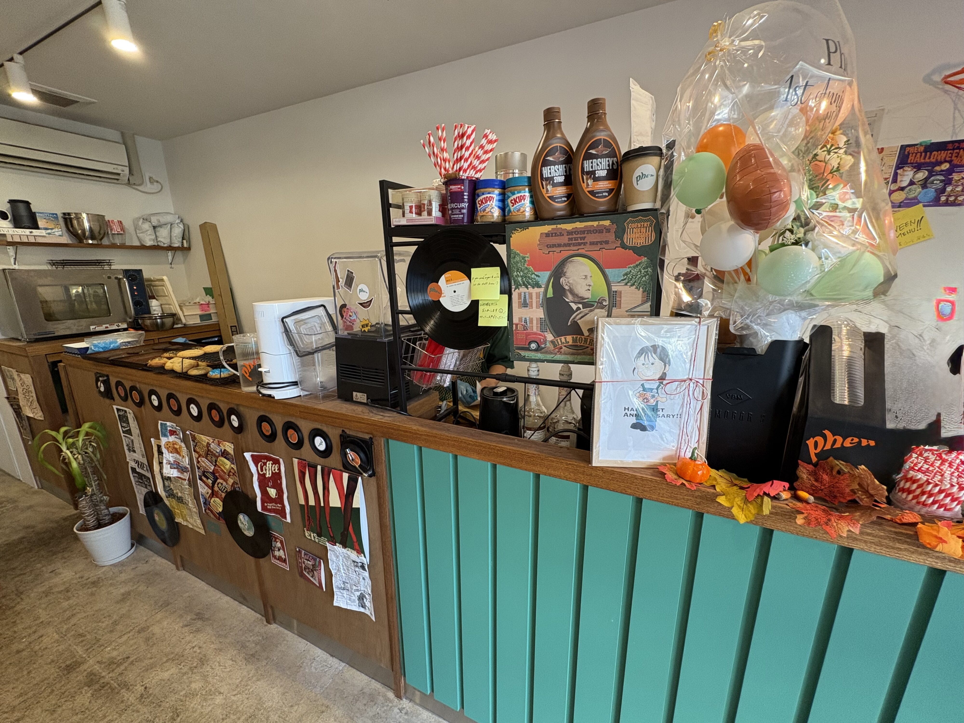 お店に入ると、ポップで遊び心あふれる空間が広がり、レコードや雑貨が並ぶカウンターは写真映えも抜群。焼きたての香ばしいクッキーと甘いドリンクの香りに包まれて、気分もほっこり☺️