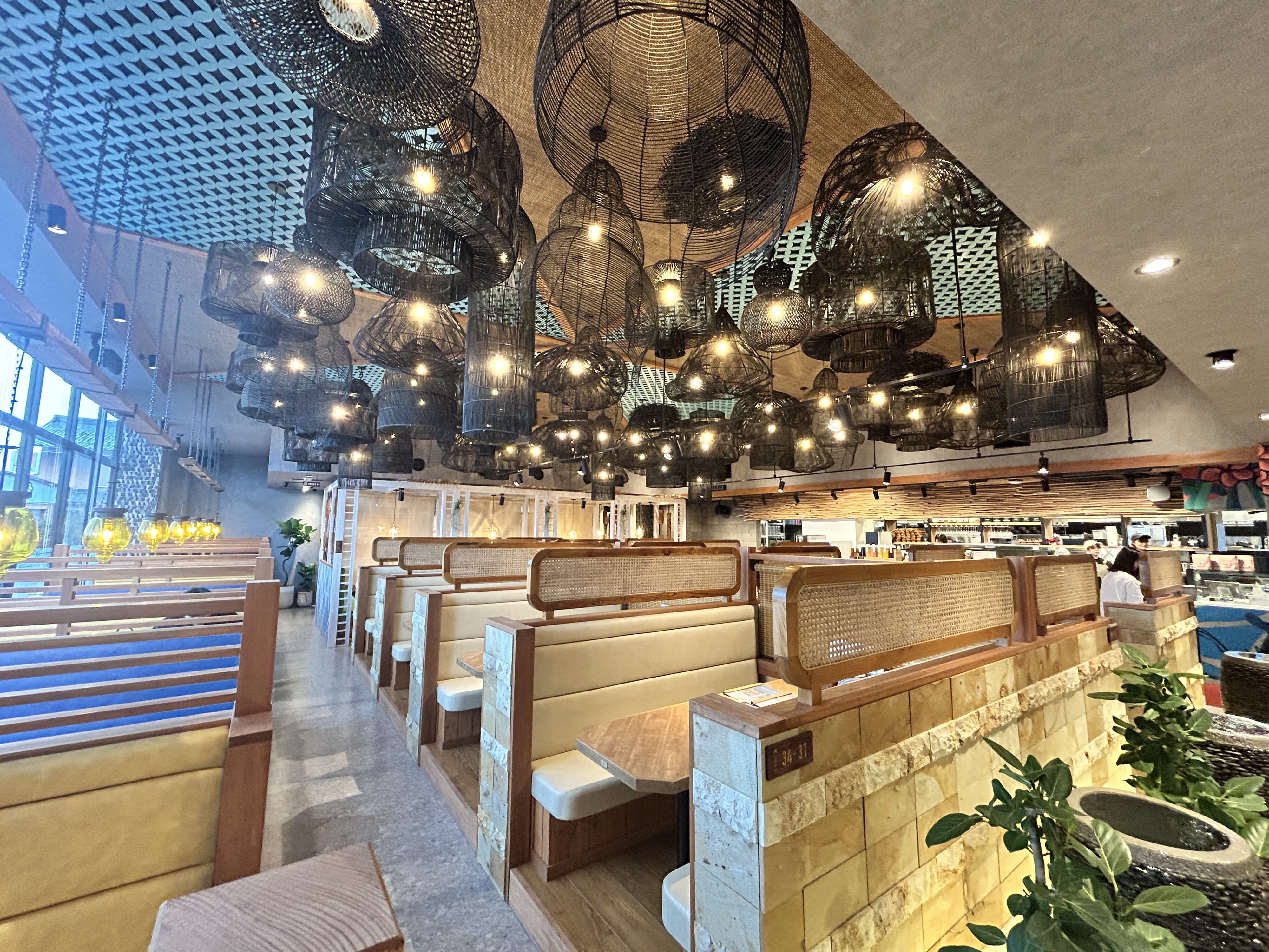 天井を埋め尽くすように吊るされたラタンの照明がふんわり灯り、まるでリゾートレストランのような雰囲気に✨