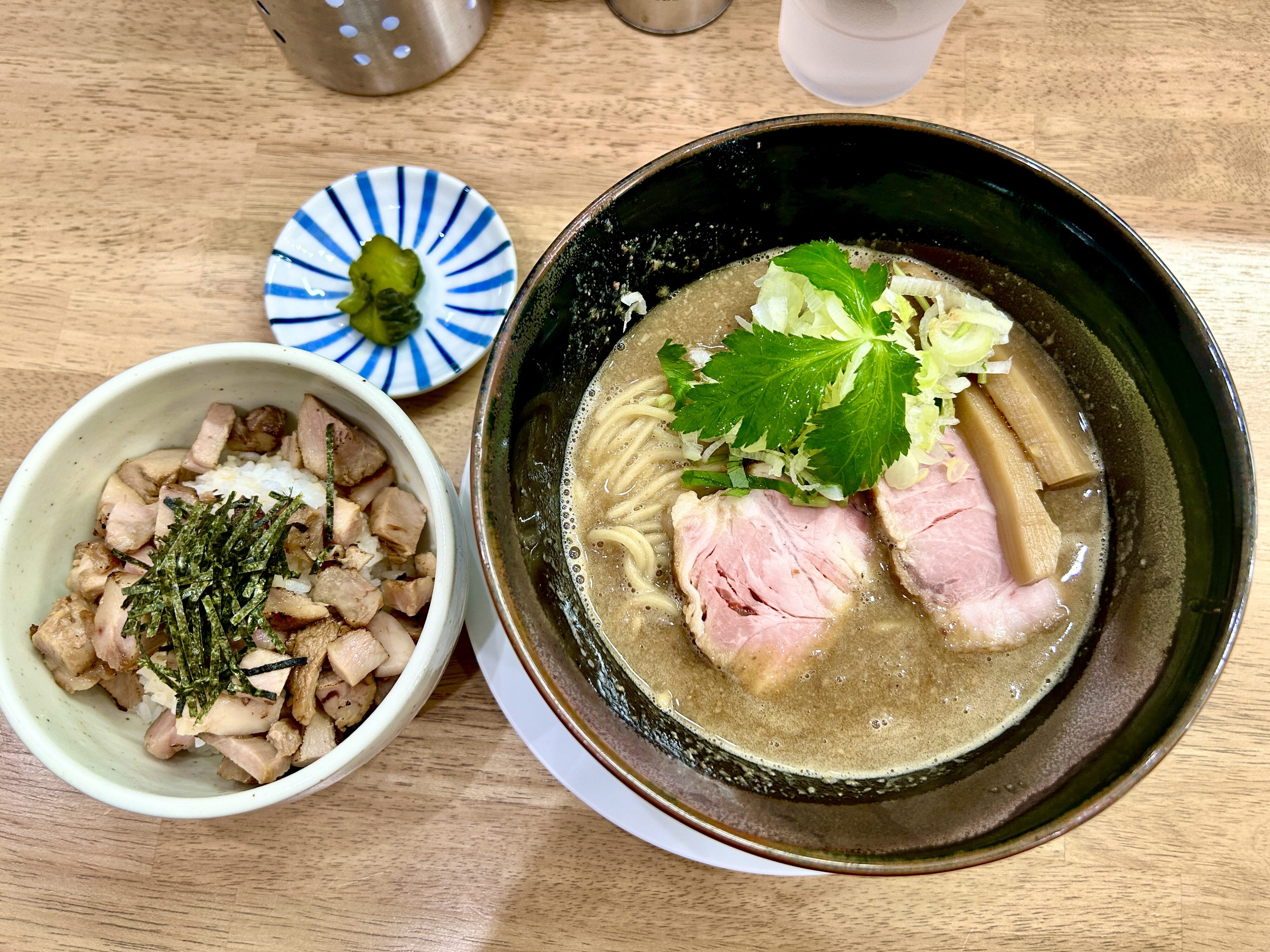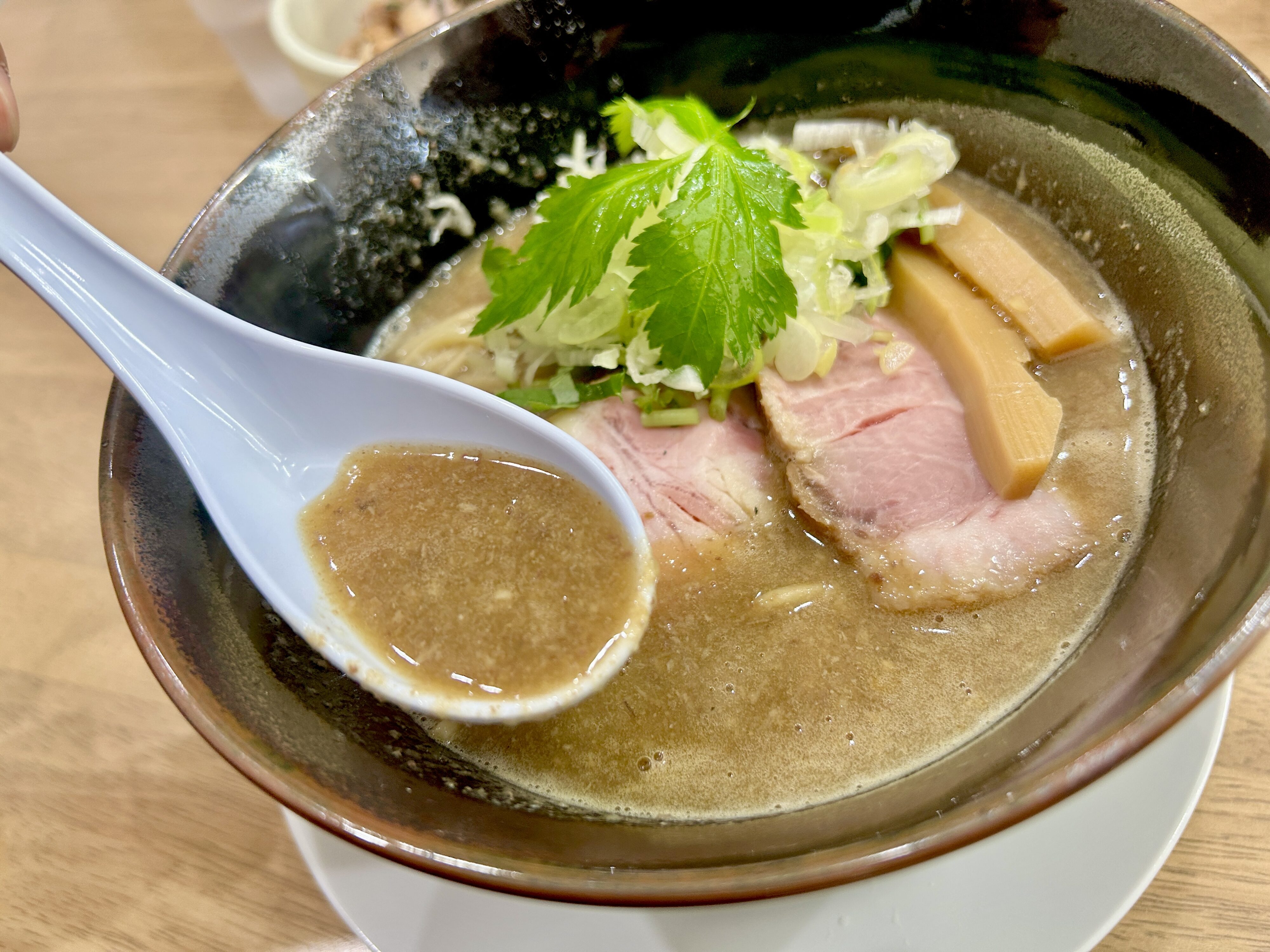 とろみのある濃厚スープにレアチャーシュー、太めメンマがのっています。魚介の香りが力強いのに、鶏のまろやかさで優しくまとまった一杯。粘度のあるスープなのに重たくなく、最後まで飲めちゃう味わいでした✨
