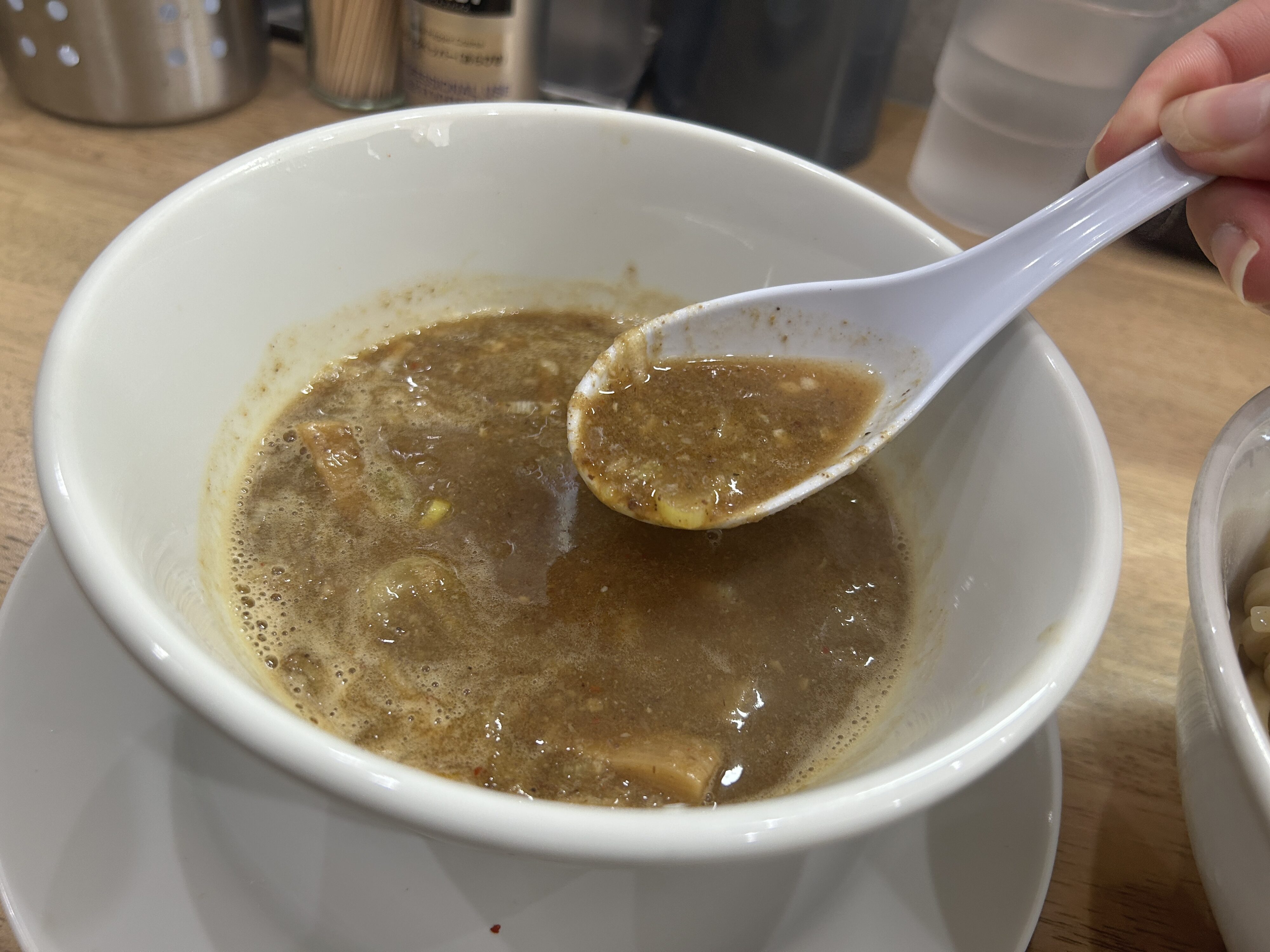 スープはしっかり濃厚で麺を少し浸すだけでしっかり絡むタイプ。特に印象的だったのが、魚粉の香りの強さと後からふわっと広がるゆずの爽やかさ!この重さと爽やかさのバランスが絶妙で、濃厚つけ麺の中でもトップクラスに食べやすい✨レアチャーシューのしっとり感も最高です✨