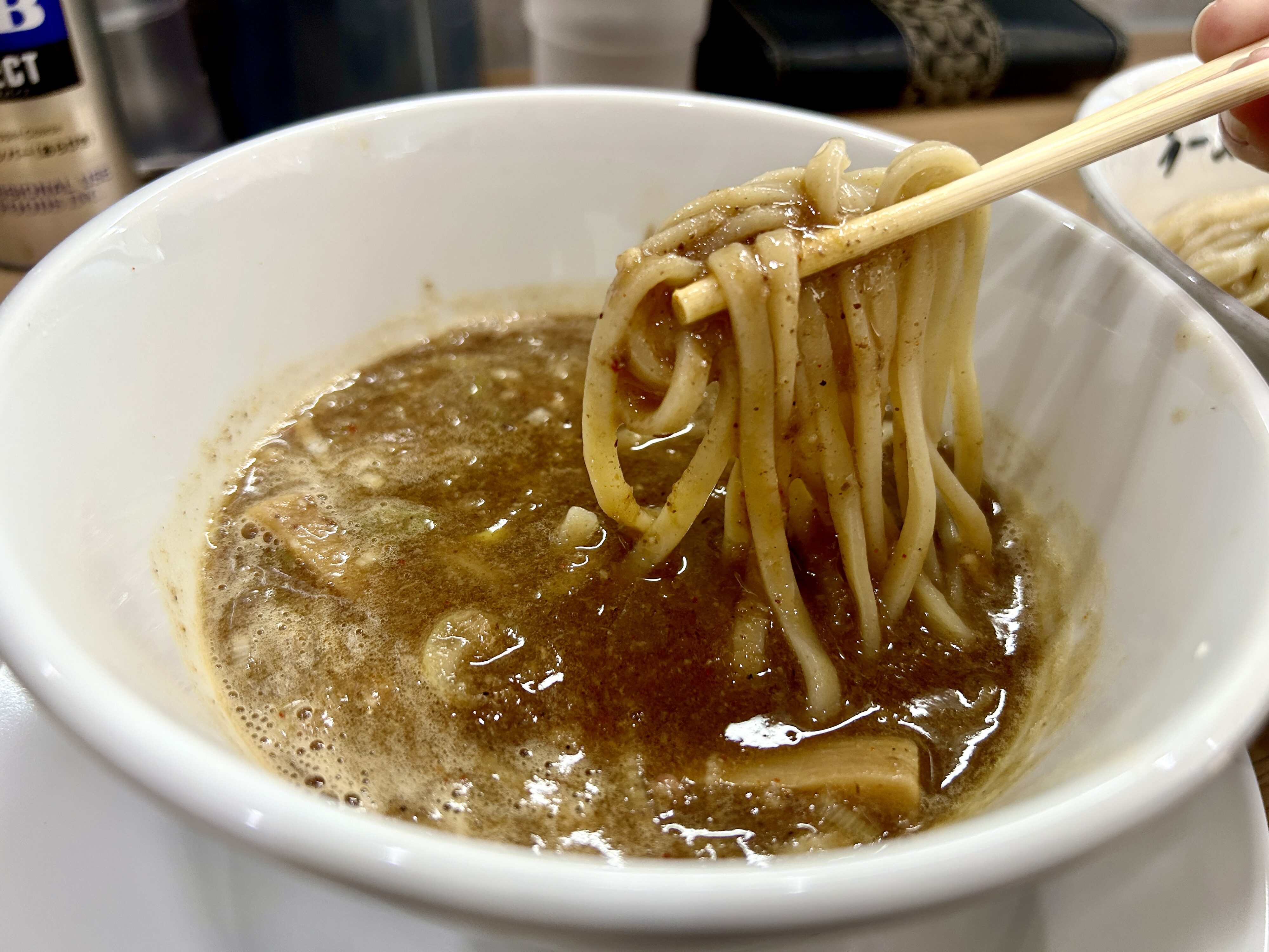 つけ麺好きの私が今回楽しみにしていた、本命のつけ麺。ストレート太麺はつるっともちもち。麺だけで美味しいのがわかるレベル。