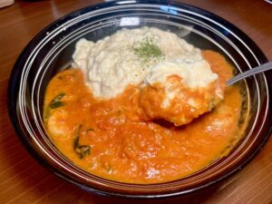 +350円だから、小さめかなと思っていたエビフライ。想像以上の大きさで、2尾も。サクサクで、揚げ具合も抜群すぎる。タルタルソースなど余計なものはなく、シンプルにルーと合わせて、ご飯を喰らいます。