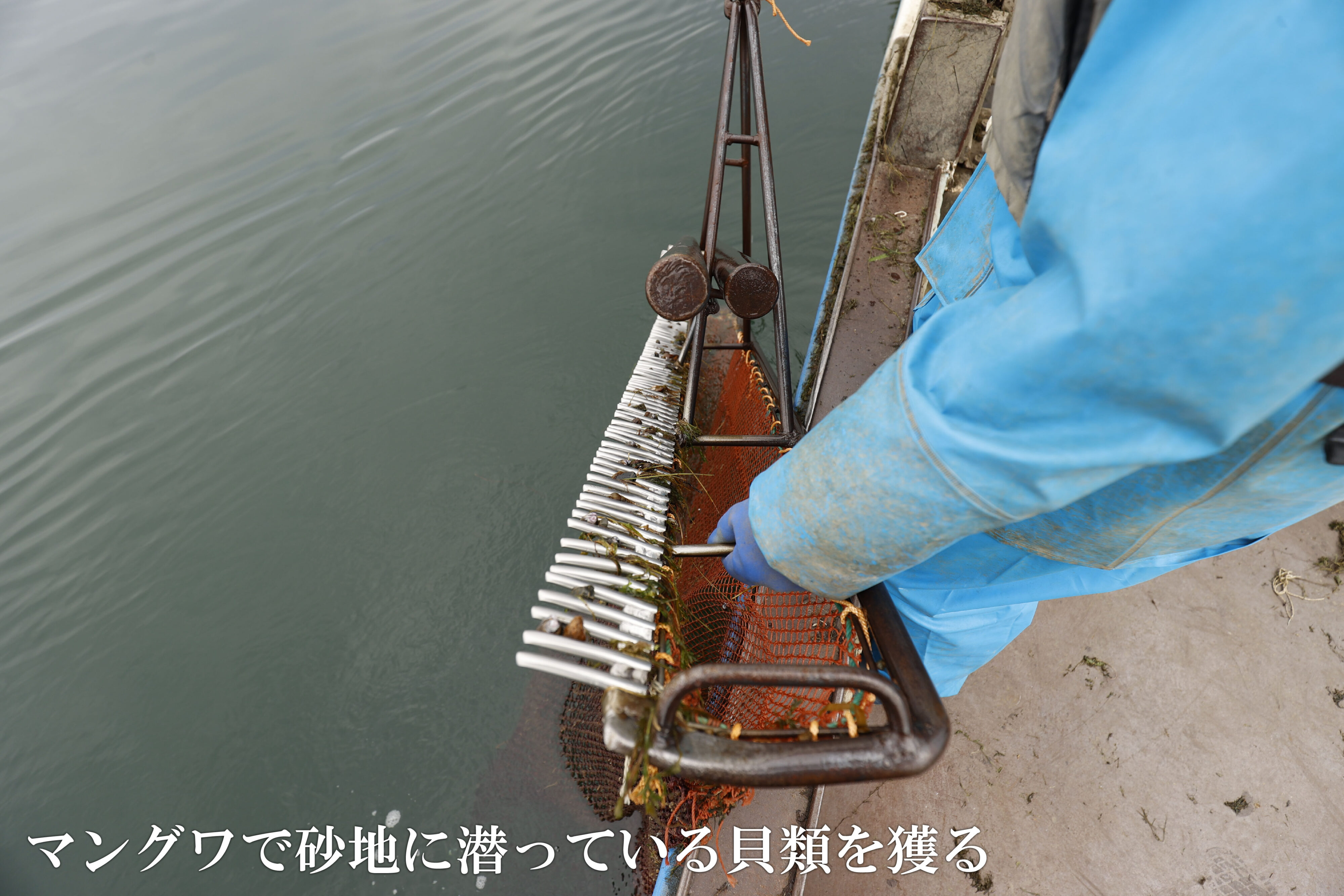 今井さんは、主に水深15ⅿまでの砂地に生息しているセタシジミを、貝びき網で獲っている。貝びき網漁業は重さ30㎏ほどのマングワと呼ばれる漁具で砂に潜っている貝類を獲る漁法だ。