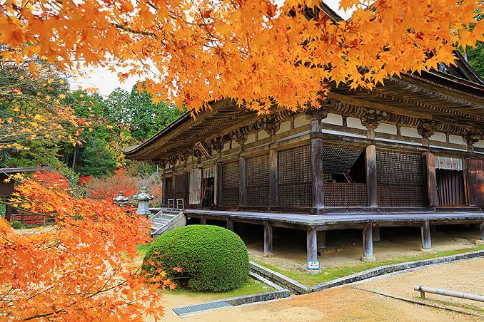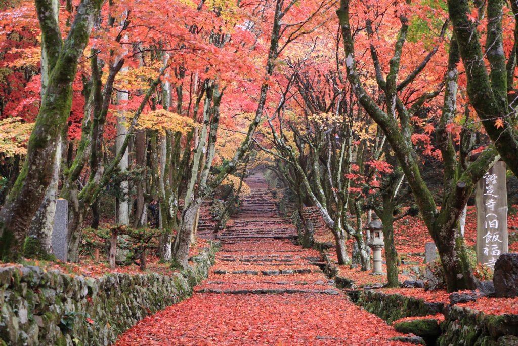 “紅葉の絨毯”として有名な古寺。石段いっぱいに落ちたモミジが広がり、幻想的な風景が広がります。