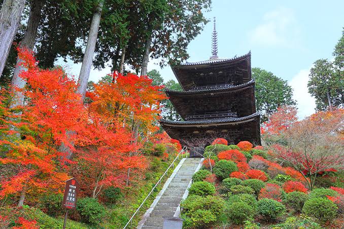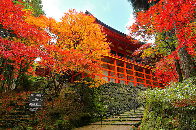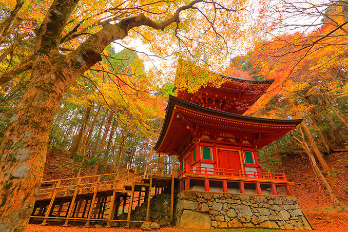 山全体が真っ赤に染まる滋賀県屈指の紅葉名所。ヤマモミジが境内を覆い、山門の上から見下ろす紅葉は圧巻!夜間はライトアップも行われ、幻想的な光景が楽しめます♪