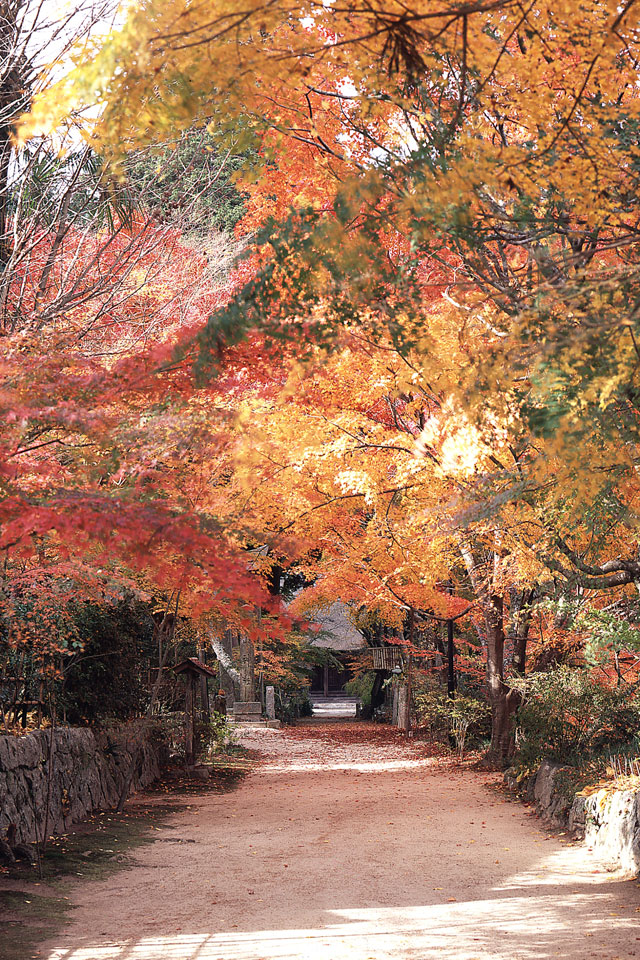 参道の”もみじのトンネル”が人気の古刹。赤く染まる参道はまるで映画のワンシーン。
