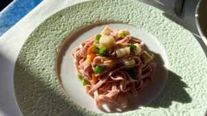 この日はスズキに姜葱醤(ジャンツォンジャン)ソース、生で食べられるかぼちゃ・コリンキーも載っているお皿は色鮮やかで食欲をそそります。