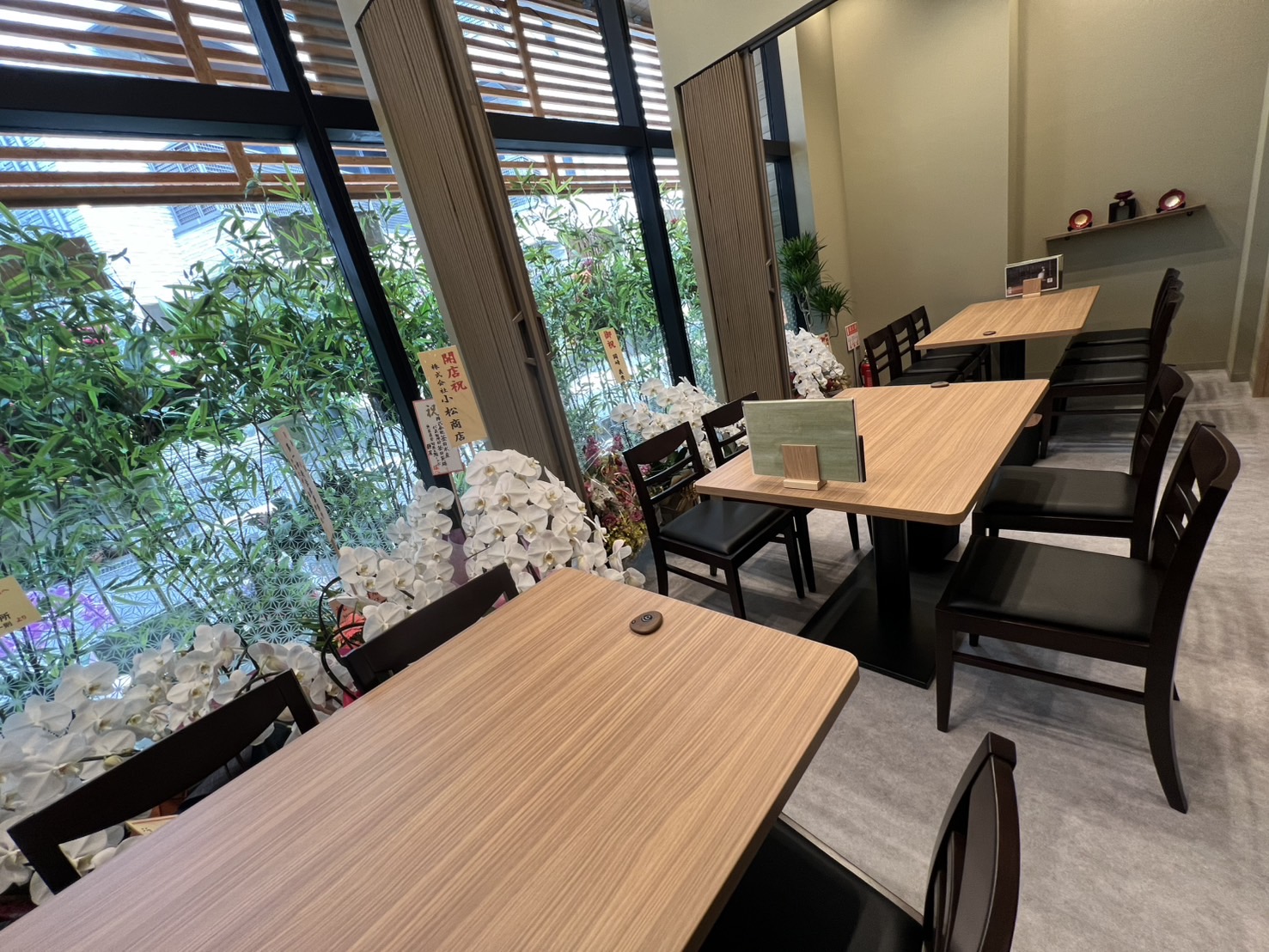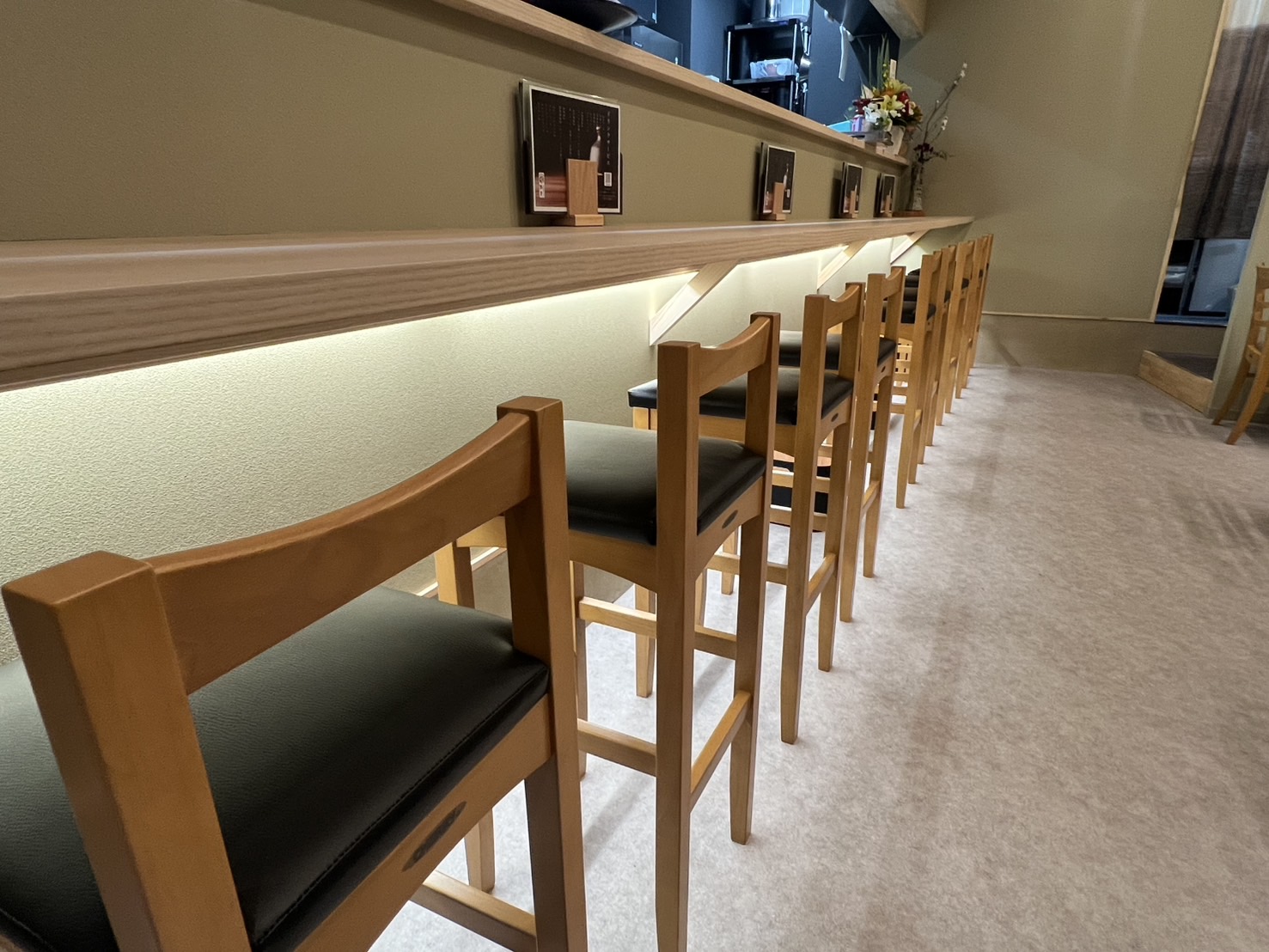 和の落ち着きを感じる上質なカウンターに、ナチュラルカラーを基調にしたスッキリとした店内。椅子やソファの色味も統一されていて、上品で居心地も◎