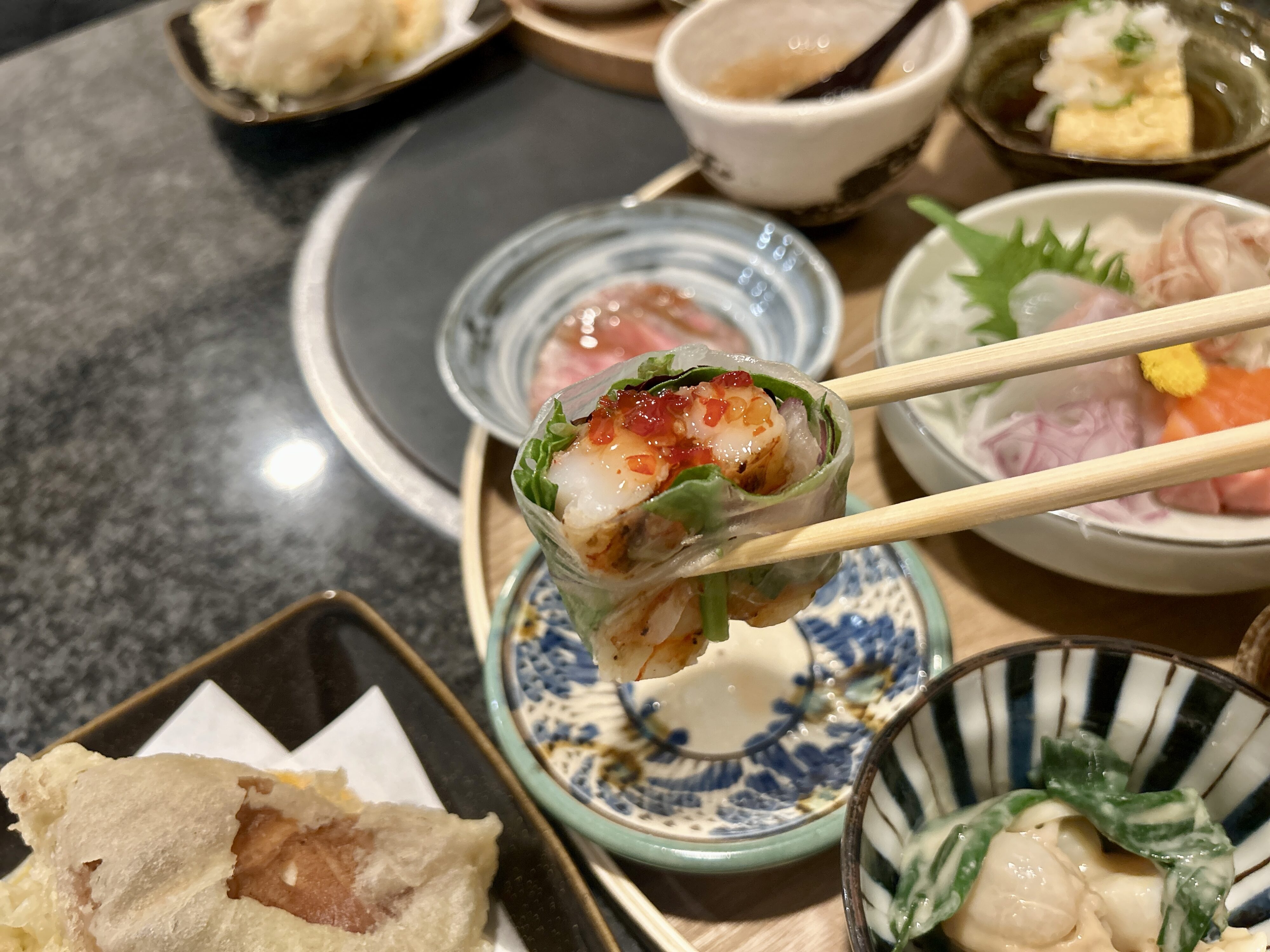 小鉢は一つひとつが丁寧な味付けで、どれも主役級。お造りは新鮮さがしっかり伝わってきて、実際に食べてみると身もぷりっぷり。