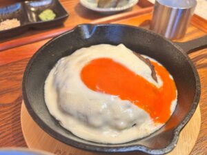 鉄板で出てくるハンバーグはアッツアツ。ジューシーというよりは肉肉しいタイプで、食べ応えもGOOD!余計なものは一切入っていないハンバーグとなっています。シンプルイズザベストっ!