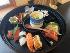 - 花(手毬寿司7貫、小鉢3種、汁物、甘味)/1800円