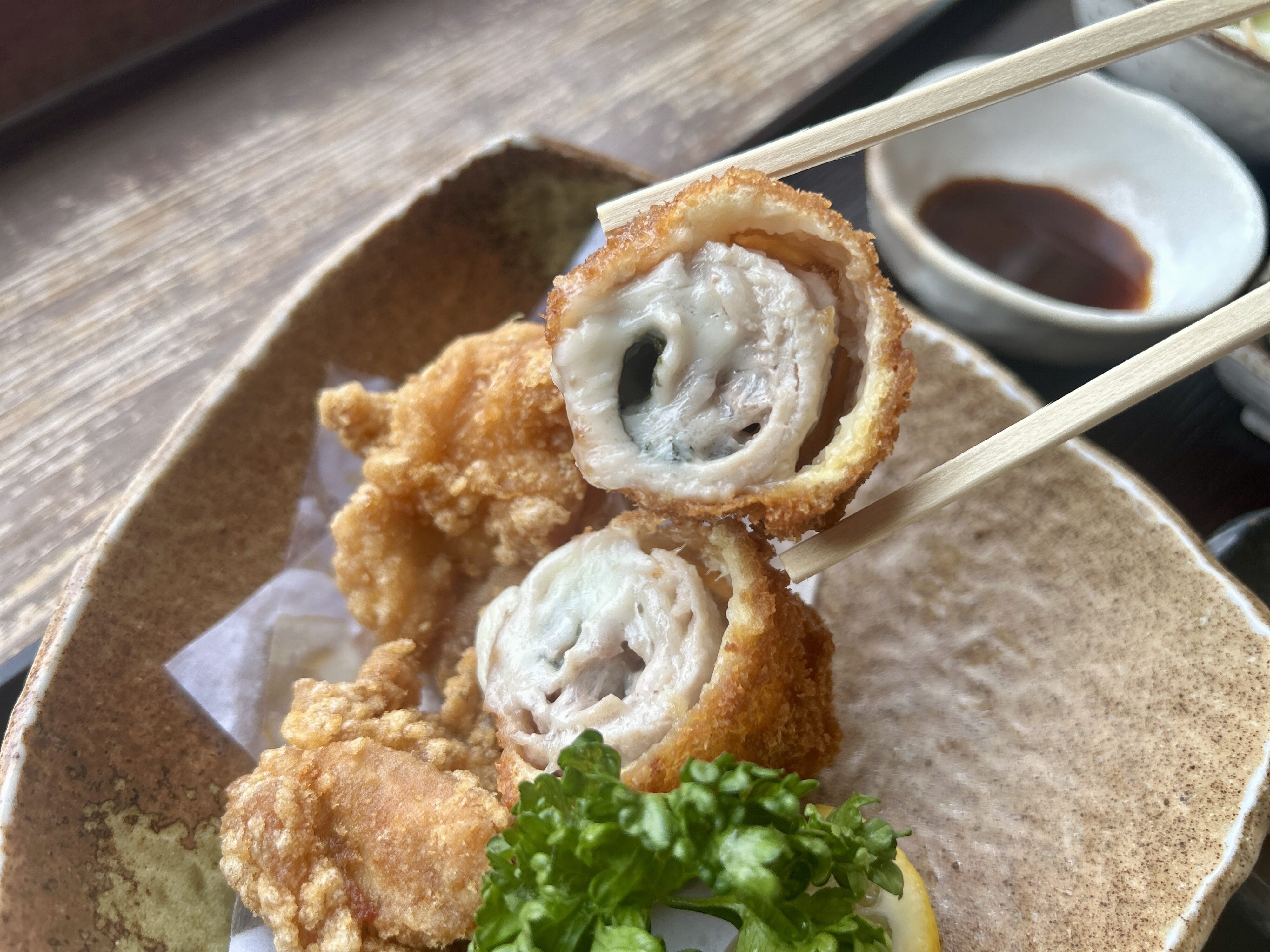 ロース巻きカツは衣がカリッと香ばしく、中からはチーズがとろっととろけ出します。