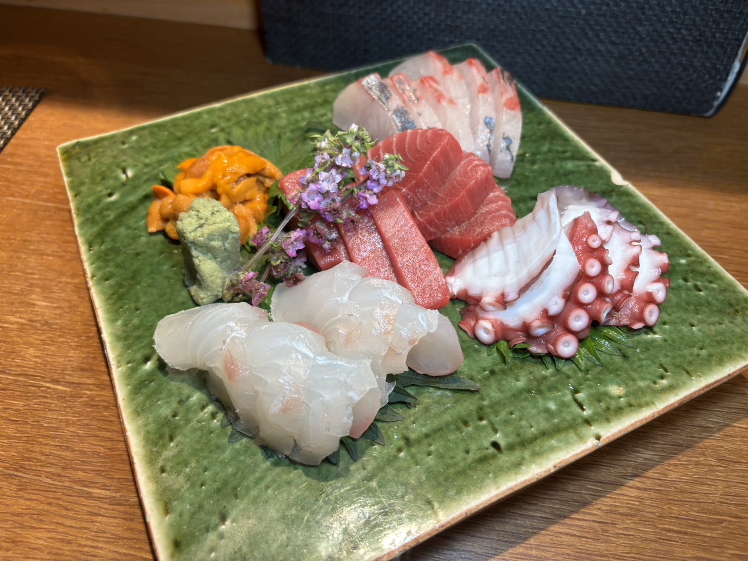 この日のお造り盛り合わせ は、・しまあじ・本マグロ・生ウニ・天然ひらめ・タコという豪華な内容✨